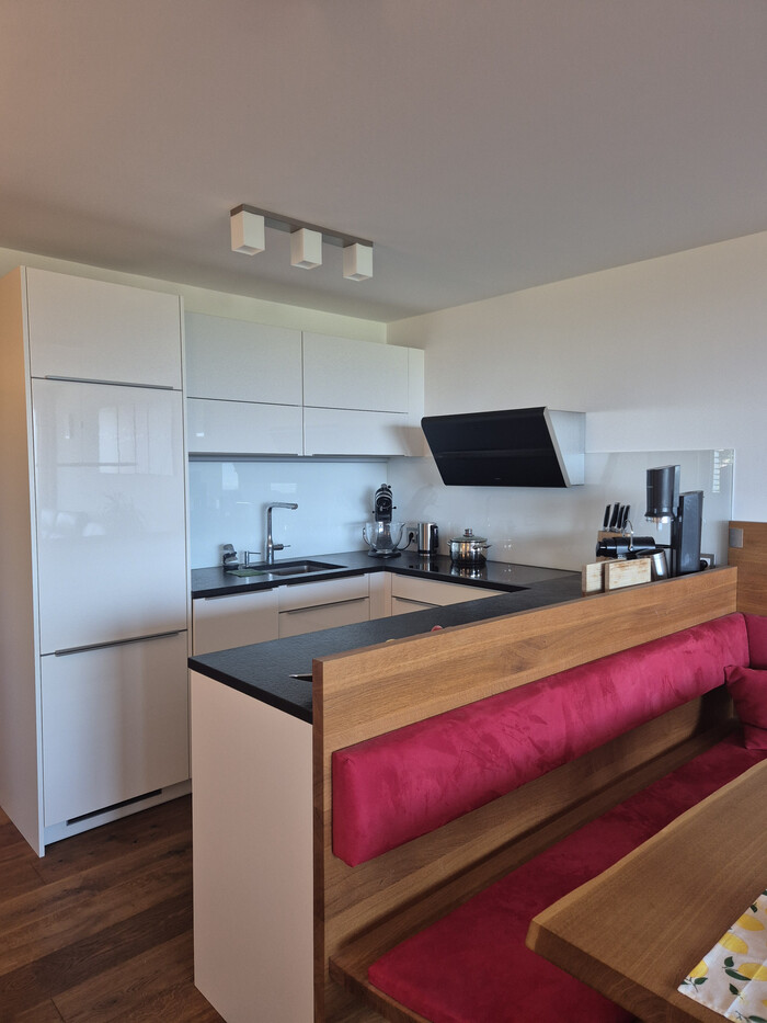 Die meisten Möbel sind Maß Anfertigungen und gehören zur Wohnung, sie werden daher mit vermietet. Alles entspricht höchstem Qualitätsstandard – und was nach Holz aussieht, ist auch echtes Holz. Ich vermiete die Wohnung mit einer sehr guten Grundausstattung, sodass kaum etwas benötigt wird, um einzuziehen. Selbst der 65-Zoll-TV mit 5.1-Heimkino von KEF bleibt in der Wohnung. Koffer packen und einziehen!
