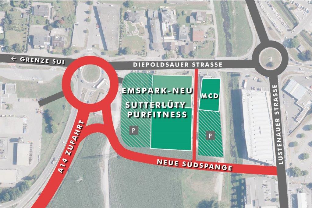 Anfang Februar konnte mit dem Bau eines neuen, zweistöckigen Gebäudes begonnen werden, das an den bereits bestehenden Emspark angrenzt und diesen vergrößert. Sutterlüty verlegt seinen derzeitigen Lebensmittelmarkt in das Erdgeschoss des Neubaus: „Wir freuen uns, dass wir nach 20 Jahren in Hohenems ab kommendem Herbst mit unserem erfolgreichen, regionalen B‘sundrigKonzept in einem neuen Gebäude vertreten sein dürfen, das bedeutet uns sehr viel“, so Jürgen Sutterlüty, Eigentümer & Geschäftsführer der Sutterlüty Handels GmbH. Im Obergeschoss finden Fitnessbegeisterte mit purfitn<ess die neueste Anlaufstelle in der Region. „Mit besten Trainingsmöglichketen, einem großzügigen Wellnessbereich und neuem Design wird purfitness Hohenems alle begeistern“, so Michael Allgäuer, Geschäftsführer der purfitness Fitnessclub VI. GmbH. Zusätzlich werden im 2. Obergeschoss zwei Büroeinheiten realisiert und ab Herbst 2021 vermietet. Die Fertigstellung des Neubaus ist für Herbst 2021 geplant.