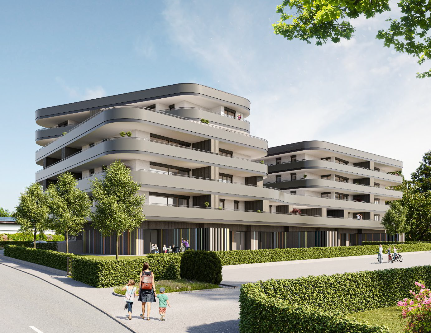 In kleinem Kreis feierten der Projektbetreiber ZIMA und Verantwortliche der Gemeinde Lochau den offiziellen Spatenstich für das Neubauprojekt „Bäumle“, das Wohnen und ein neues Kinderhaus miteinander kombiniert. Entstehen werden hier zwei fünf- bzw. sechsstöckige Baukörper, die mit ihren schwungvollen Abrundungen und Höhenlinien die angemessene Harmonie zwischen Wohnkomfort und Landschaft schaffen. So fügt sich das Projekt perfekt in seine Nachbarschaft am See ein. Die weitläufigen Terrassen der 2- bis 4-Zimmer Wohnungen, bieten den perfekten Rahmen für erholsame Momente im Freien. Großflächige Panoramaverglasungen eröffnen den Blick teils auf den See und den Pfänderstock. Obligatorisch sind die Tiefgarage mit genügend Einstellplätzen, Lift, Kellerabteile sowie großzügige Trocken- und Fahrradräume.