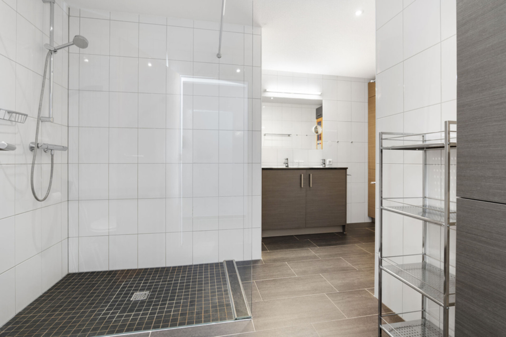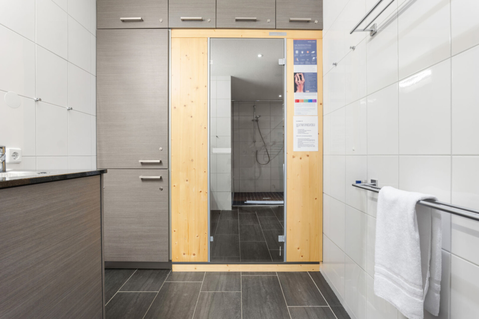 Die Badezimmer und der nach Süden ausgerichtete sonnige Balkon verfügen beide über einen robusten und pflegeleichten Fliesenboden. Das Haupt-Badezimmer verfügt zudem über eine Infrarotsauna und mehrere private Einbauschränke.