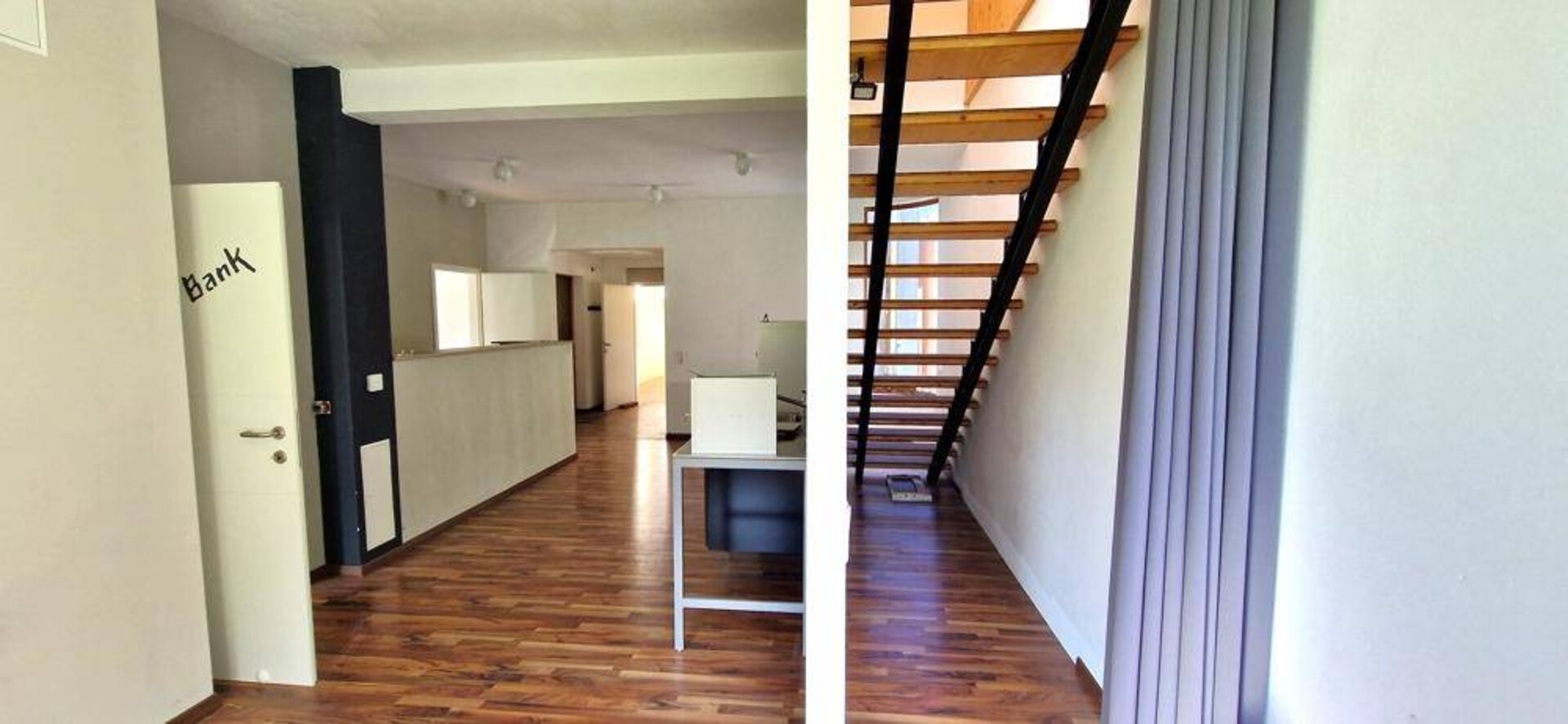 Im Erdgeschoss befinden sich ein Empfangs- und Wartebereich sowie zwei kleinere Büroräume ca. 60 m2, die durch Trockenbauwände getrennt werden. Die Wände könnten bei Bedarf entfernt und die Räume zu einem geräumigen Büro zusammengefasst werden. Des Weiteren befinden sich im Eingangsbereich ein Damen- und Herren WC sowie eine Werkstatt mit ca. 60 m². Mit einer Laderampe und automatischem Tor versehene Halle bietet sich optimal als Lager oder eine Werkstätte für kleinere Handels-oder Handwerkbetriebe an.