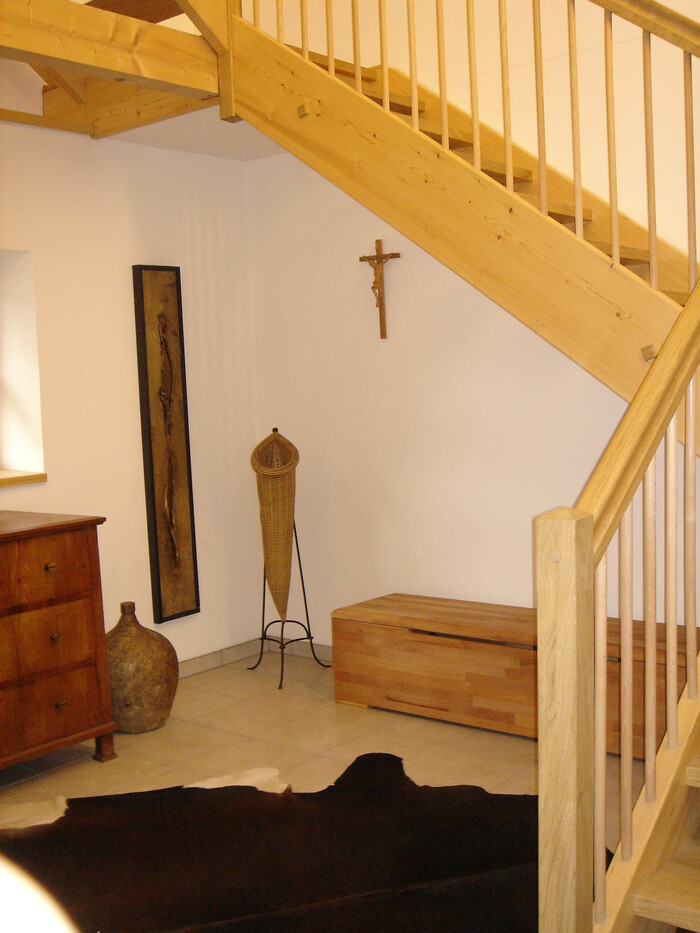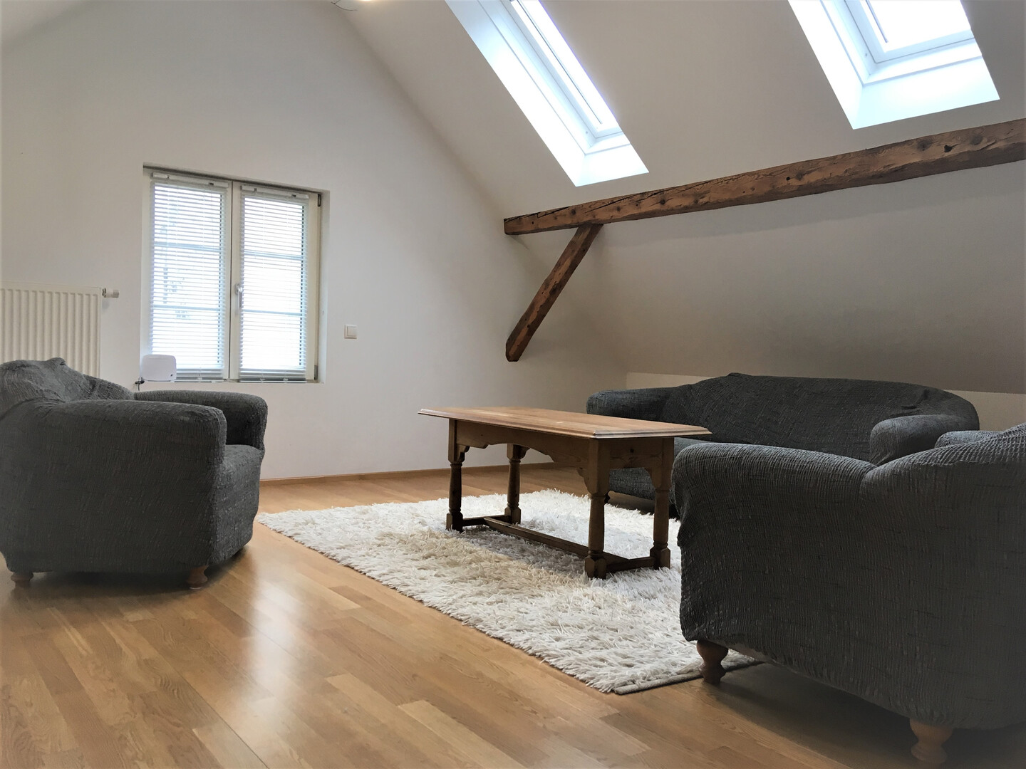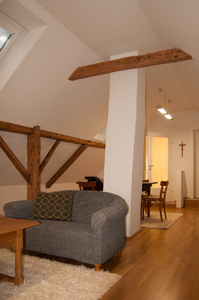 Es handelt sich dabei um das Dachgeschoss, welches über ein separates Treppenhaus zugänglich ist. Das Raumprogramm umfasst zwei loftartige Räume mit sichtbaren Deckenbalken, sowie ein Badezimmer mit Dusche und WC.