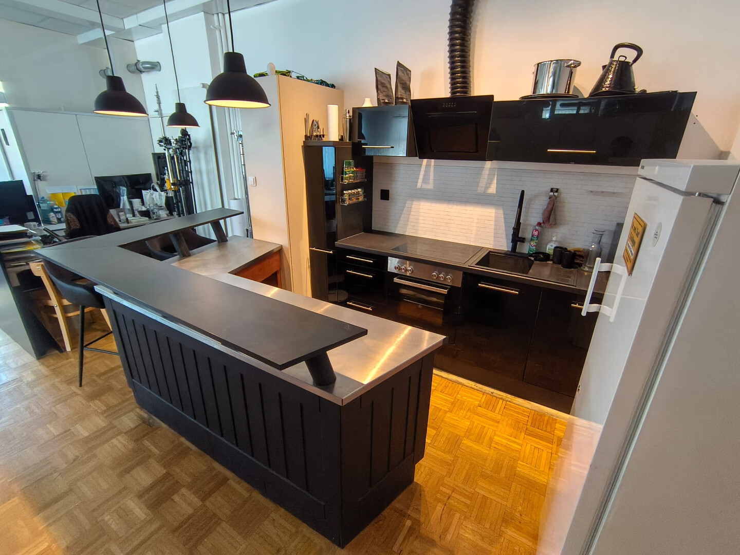 Eingangsbereich mit Garderobe, Bürofläche mit Parkettboden, WC Anlage, gut ausgestattete Küche