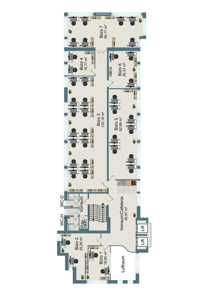Die Büroflächen in Kennelbach bieten ein hohes Niveau an Arbeitsqualität und Ausstattung. Das 1. Obergeschoss mit einer Fläche von insgesamt 208,17 m² ist Teil eines fünfgeschossigen Bürogebäudes und bietet ideale Bedingungen für Unternehmen, die ein hochwertiges und zugleich funktionales Arbeitsumfeld suchen. Die insgesamt 7 Büroräume in unterschiedlichen Grössen, verfügen über eine übersichtliche Struktur und eine hochwertige Ausführung. Diese können als Büro sowie auch als Besprechungsraum genutzt werden. Die gesamte Ebene ist mit einer zeitgemäßen Inneneinrichtung ausgestattet, die funktionale Arbeitsabläufe unterstützt. Bei Bedarf stehen zusätzliche Lagerflächen zur Verfügung. Die Bürofläche wird vollständig mit einer hochwertigen Ausstattung angeboten, die optional übernommen werden kann. Dadurch ist ein effizienter Einzug ohne zusätzliche Investitionen möglich.