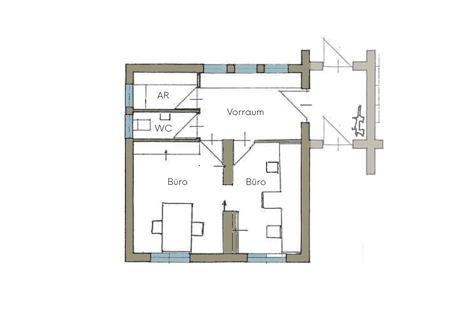 Die Fläche umfasst einen Vorraum, zwei separate Büroräume (einen davon derzeit mit zwei Arbeitsplätzen, der andere ist als Einzelbüro nutzbar). Auf Wunsch können die Möbel weitergenutzt werden.