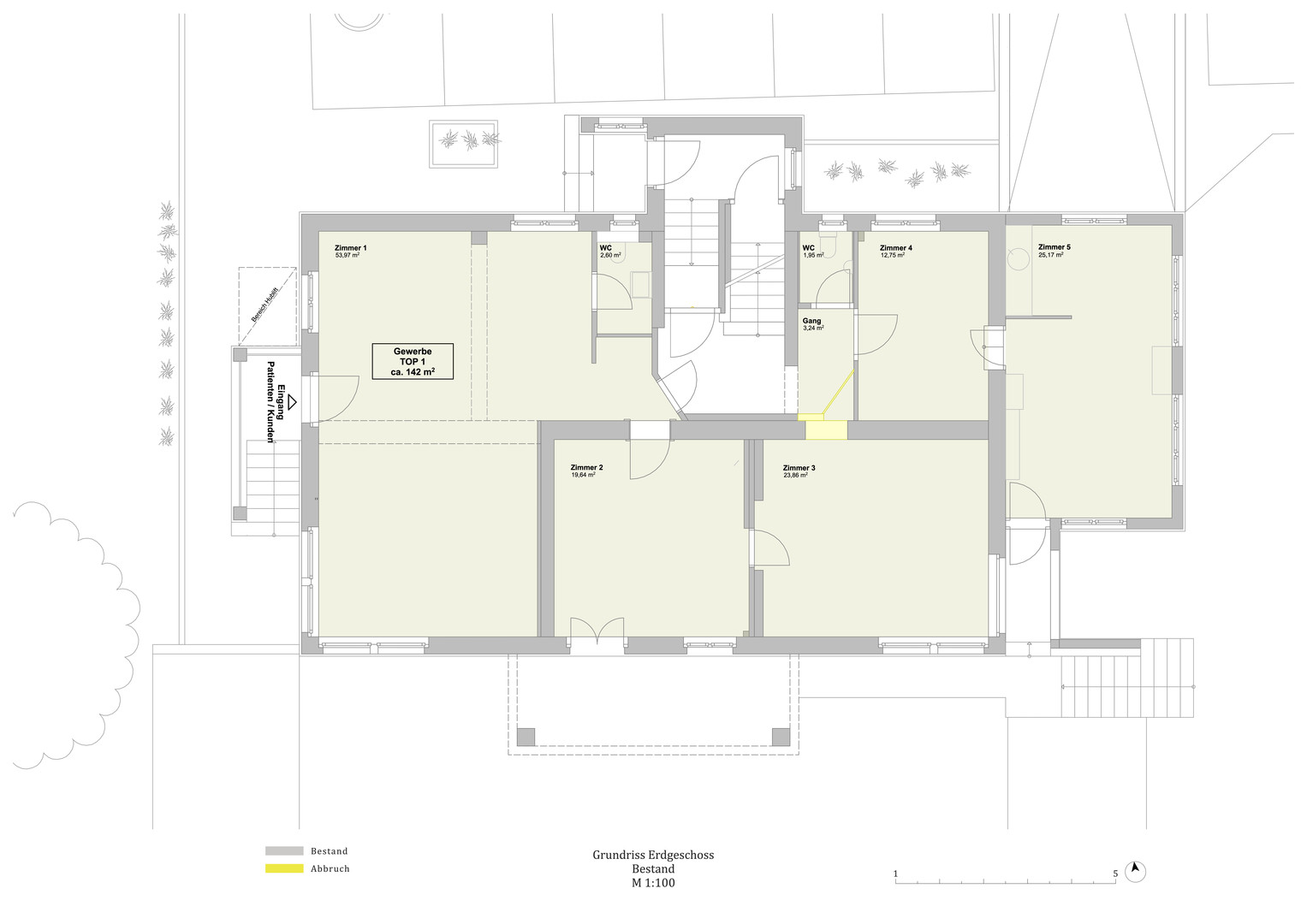 Mit leichten Adaptierungen und neuer Unterteilung des Bestands kann z.B. eine neue Praxis mit großzügigem Entree und Wartebereich, drei Behandlungszimmer und ein barrierefreies Patienten-WC entstehen. Im hinteren östlichen Teil können alle benötigten Räumlichkeiten für Personal und Verwaltung untergebracht werden. (siehe Dossier Plan Ausbauvariante)