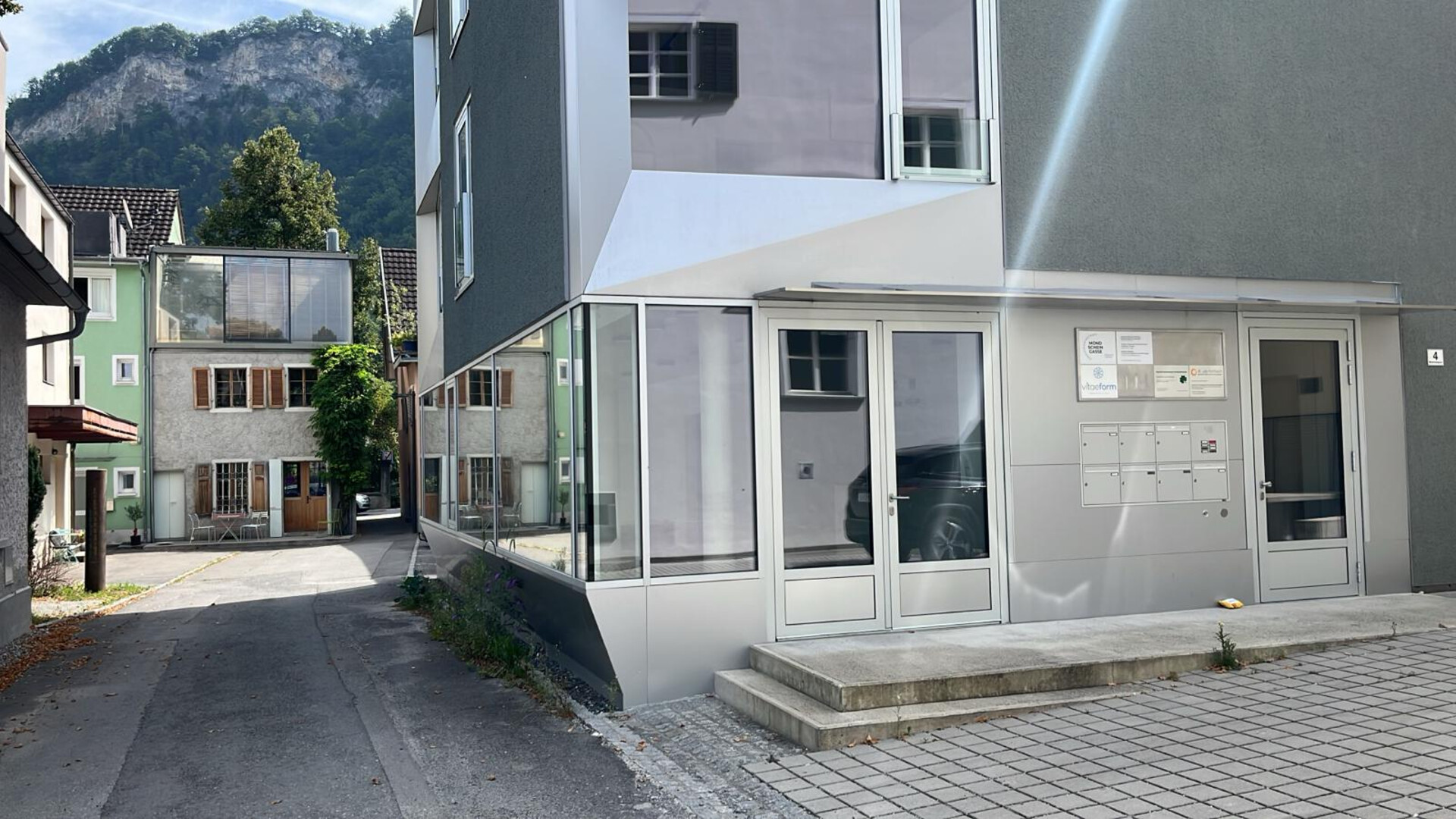 Gleich angrenzend, in zweiter Bautiefe, wurde an der Mondscheingasse ein modernes, architektonisch außergewöhnliches Büro- und Geschäftshaus realisiert. Zwischen den beiden Baukörpern spannt sich ein kleiner attraktiv gestalteter Innenhof.