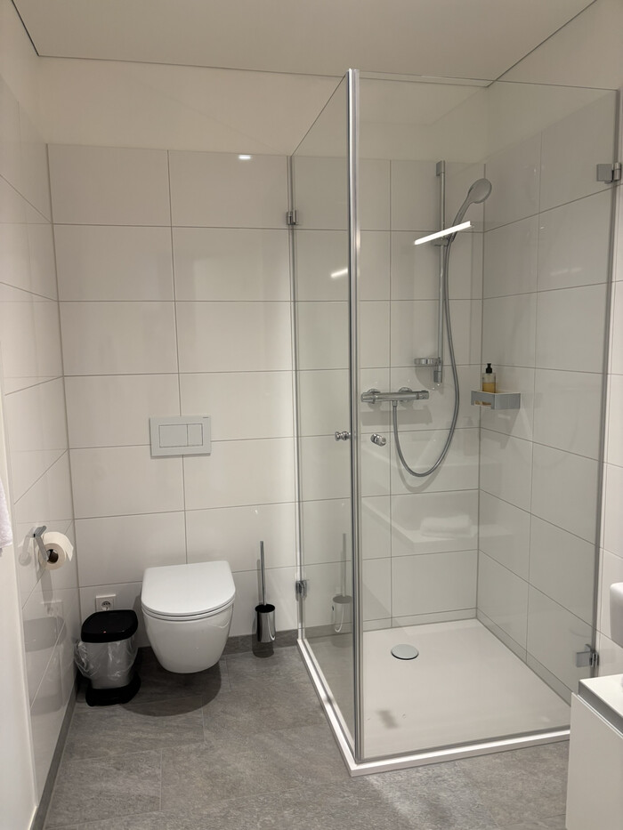Moderne Büroräumlichkeiten mit kleinem Balkon, Waschraum mit integrierter Dusche und WC,