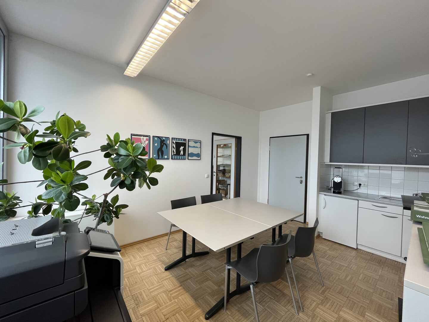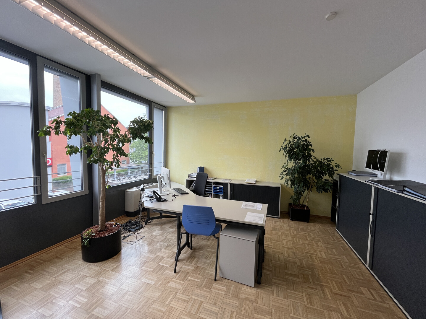 Die Büroräumlichkeiten mit ca. 40 m² Nutzfläche und hoher Raumhöhe (ca. 2,8 m) befinden sich im 1.OG vom Haus E, sind hell und freundlich und ausgestattet mit einer Kühlung, Parkettboden, großer Fensterverglasung mit Außenbeschattung, einer Teeküche, EDV-Verkabelung über Bodendosen und einem elektronischen Zutrittssystem. Das Damen- und Herren-WC sind gemeinsam mit anderen Mietern vom Stockwerk zu nutzen. Kostenlose Kundenparkplätze sind im Areal vorhanden. Stellplätze für Mitarbeiter können im Parkhaus um € 56,- netto p.m. zzgl. € 13,50 p.m. Betriebskostenpauschale gemietet werden.