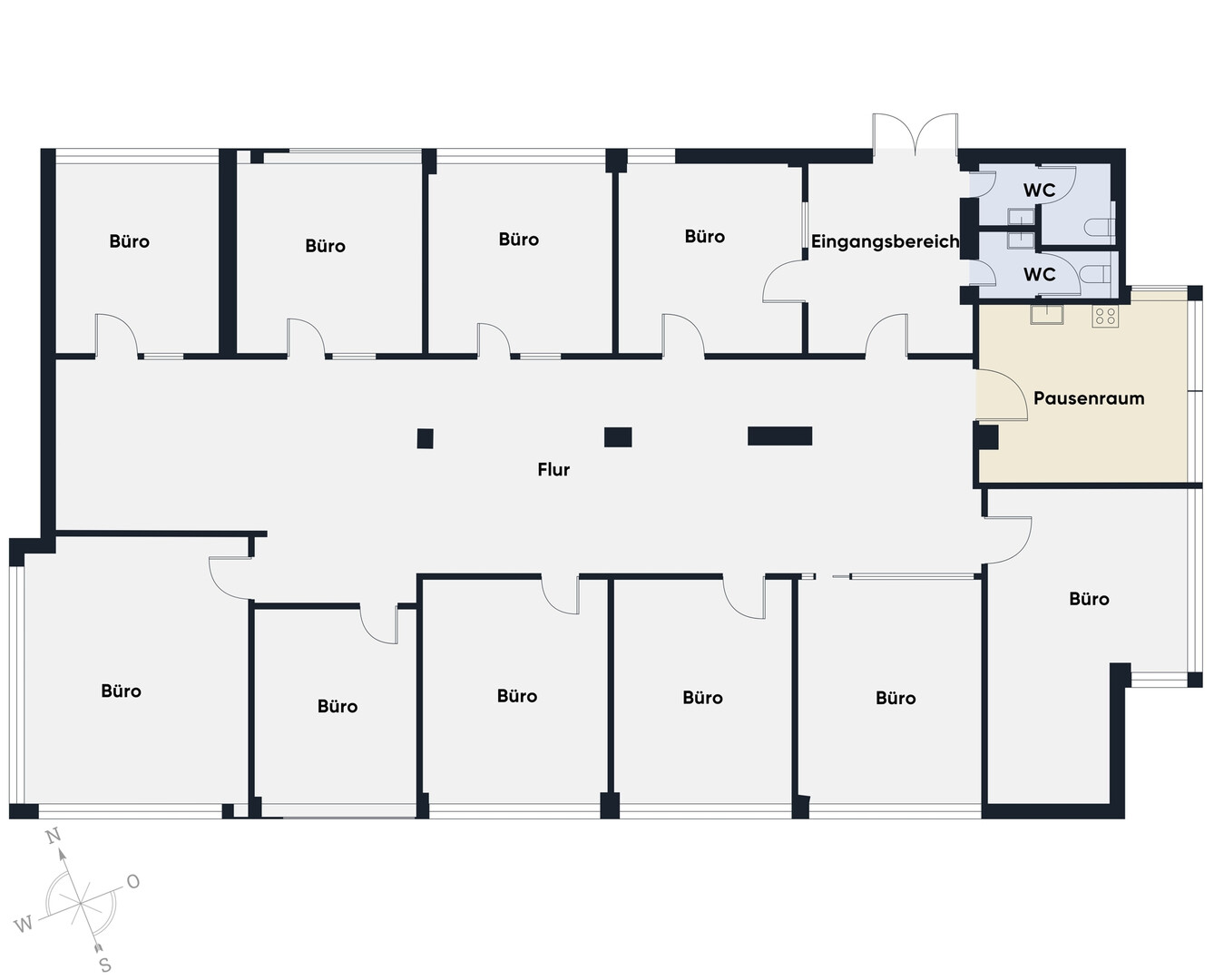 Auf insgesamt 318,22 m² Nutzfläche stehen 10 helle Büroräume sowie ein Pausenraum zur Verfügung, die vielfältige Arbeits- und Gestaltungsmöglichkeiten bieten. Eine Klimaanlage sorgt dabei jederzeit für ein angenehmes Raumklima.