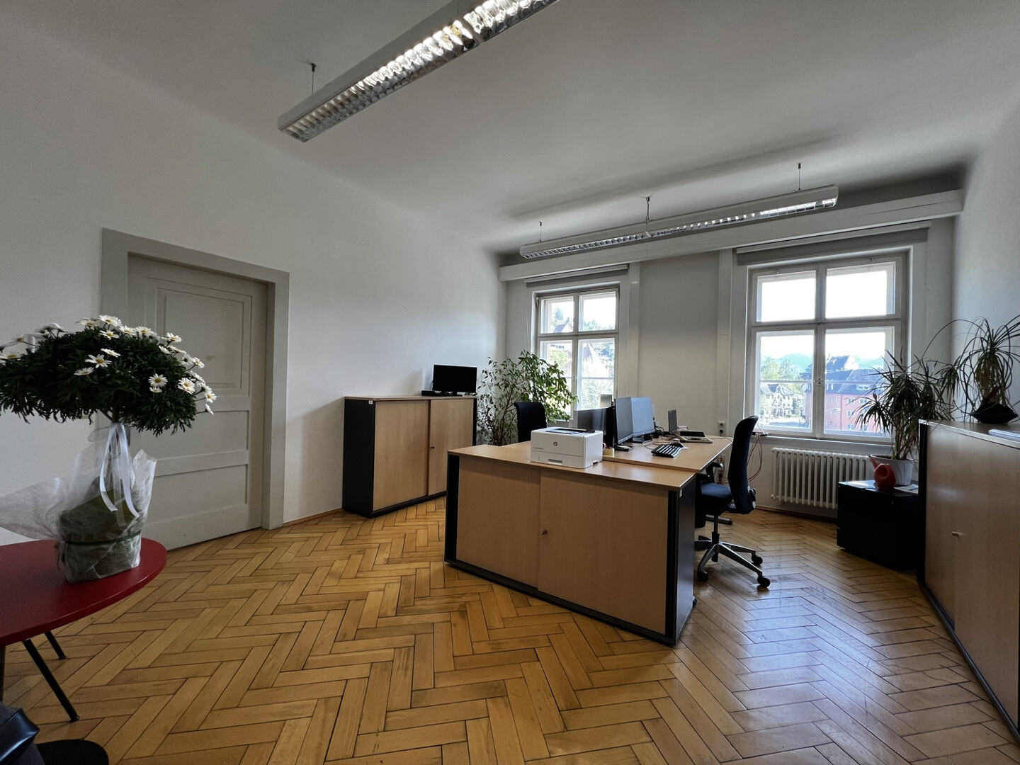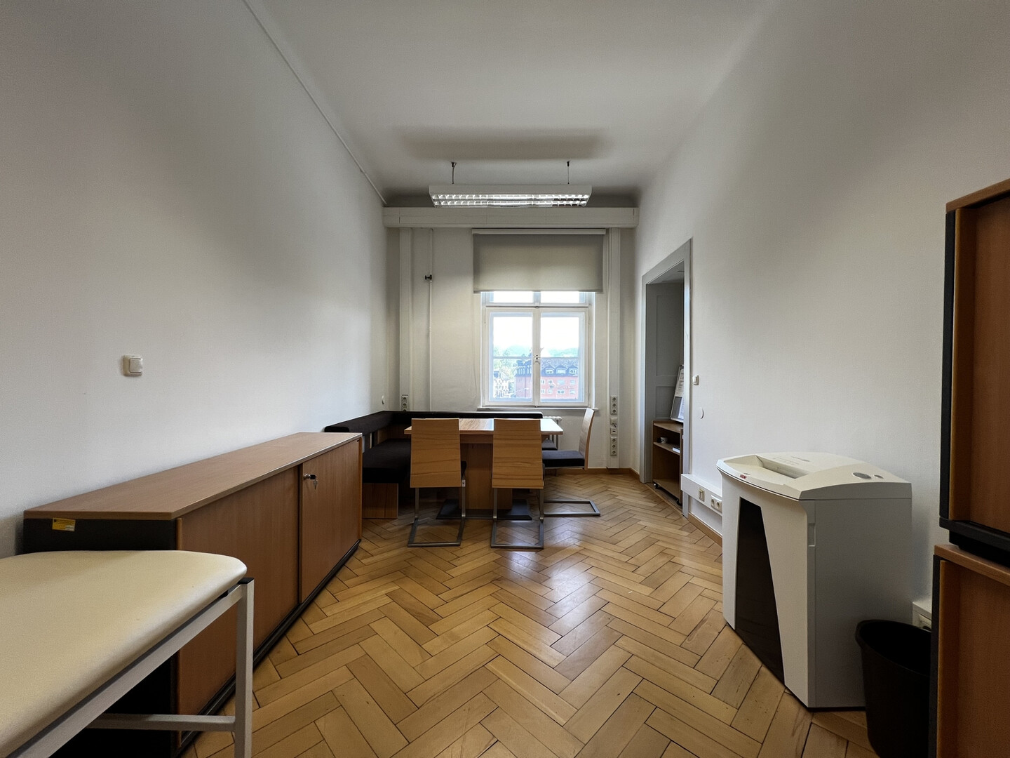Die in insgesamt vier Büroräume unterteilten Flächen bestechen durch ihren klassischen Altbaustil. Merkmale wie das elegante Fischgrätparkett, große Altbaufenster und die großzügige Raumhöhe tragen zu einem charmanten und repräsentativen Arbeitsumfeld bei.