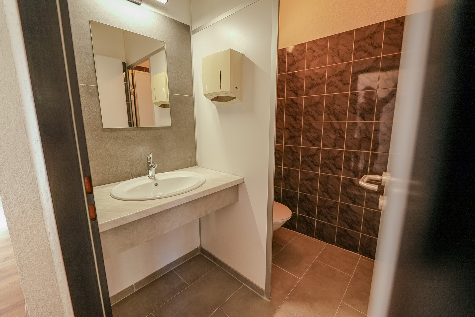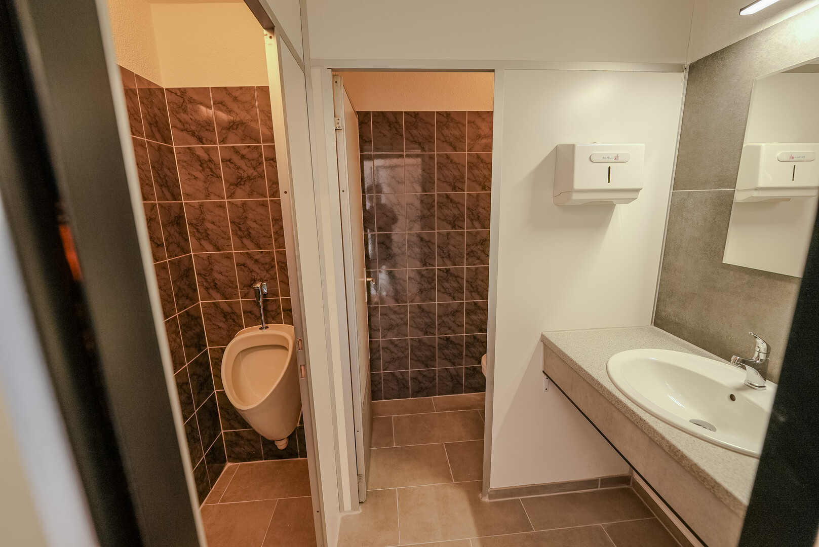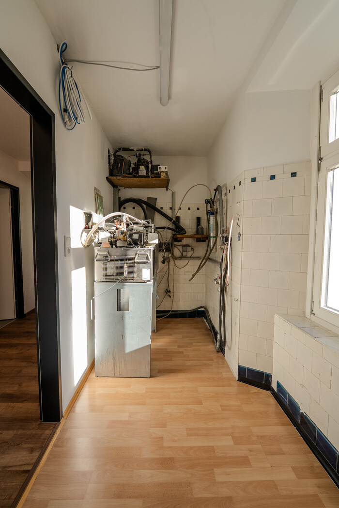 Das Lokal verfügt über einen Hauptraum sowie zwei kleinen Getränkelager (ca. 5 m² & 2m²), einen Durchgangsraum (ca. 7 m²) und einen größeren Raum mit ca. 20 m². Zusätzlich gibt es eine Terrasse (ca. 12 m²) sowie sanitäre Anlagen mit ca. 5 m². Die angrenzende kleine Küche (ca. 6 m²) ermöglicht die Zubereitung einfacher Speisen.