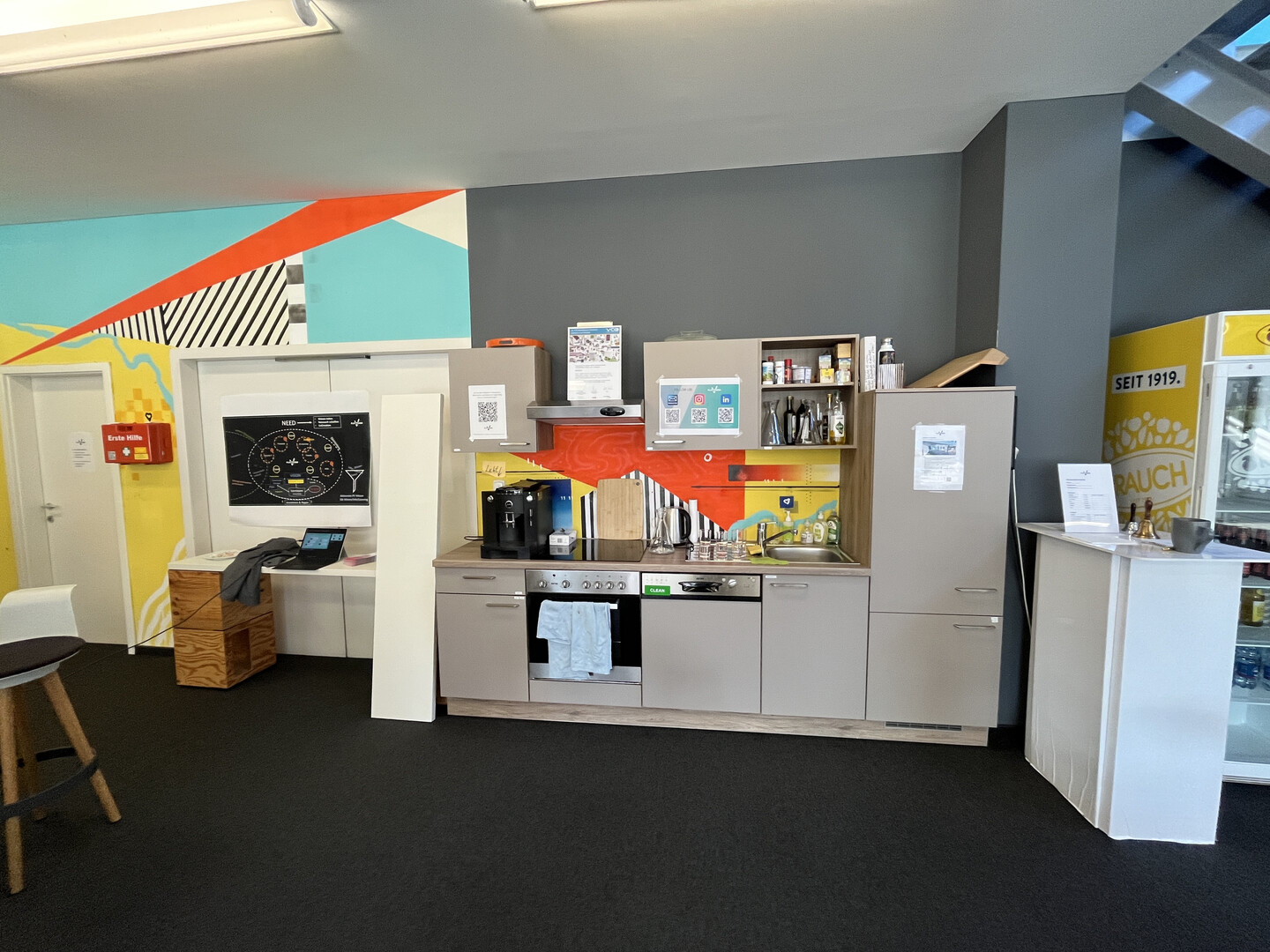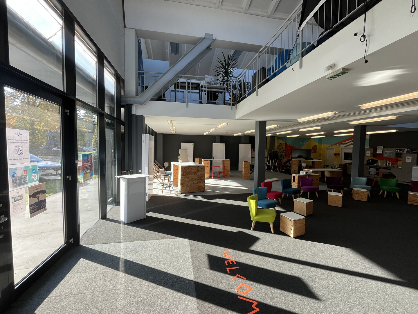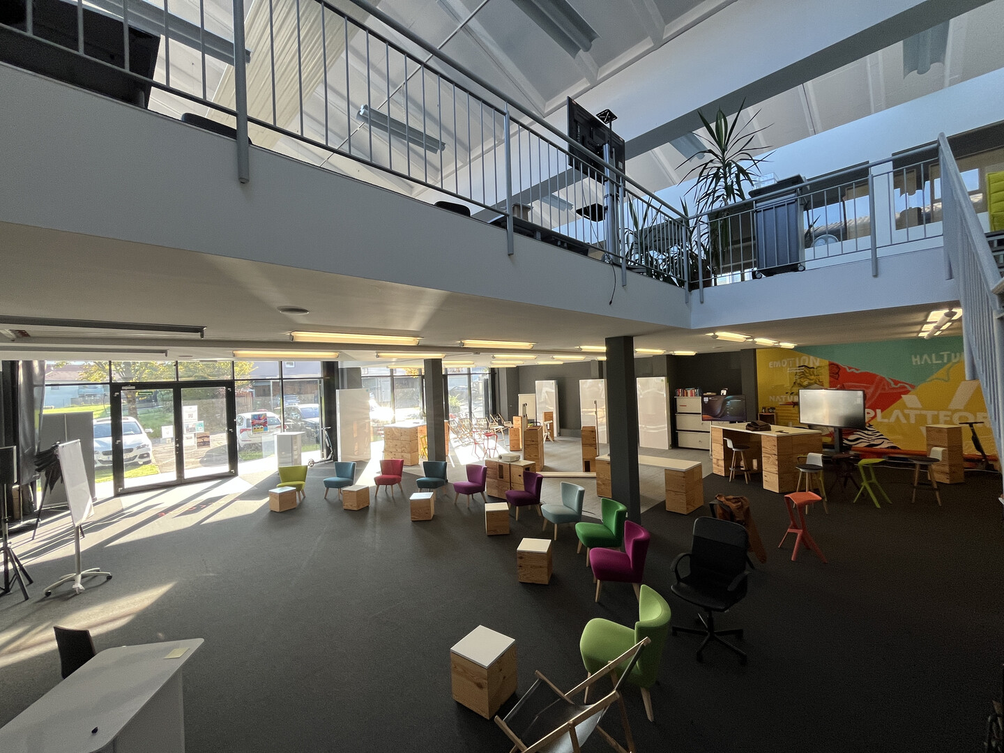 Die Geschäftsräumlichkeiten (Verkauf, Büro) mit gesamt ca. 414 m² (im Grundrissplan rot umrandet) sind aufgeteilt auf ca. 243 m² im Erdgeschoss und ca. 171 m² im 1. Obergeschoss, sind über eine interne Stiege verbunden und verfügen über große Schaufensterflächen und hohe Raumhöhen. Ausgestattet sind die Räumlichkeiten mit Teppichboden, EDV-Verkabelung, einer Teeküche, zwei WC-Anlagen und elektronischem Zutrittssystem. Kostenlose Kundenparkplätze sind vor dem Eingang und im Areal vorhanden. Stellplätze für Mitarbeiter können im angrenzenden Parkhaus um € 56,- netto p.m. zzgl. € 13,50 p.m. Betriebskostenpauschale gemietet werden.