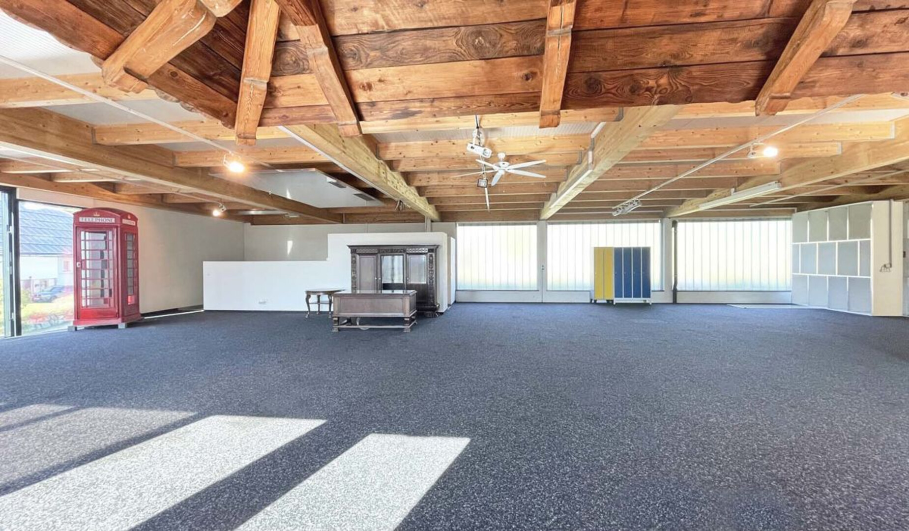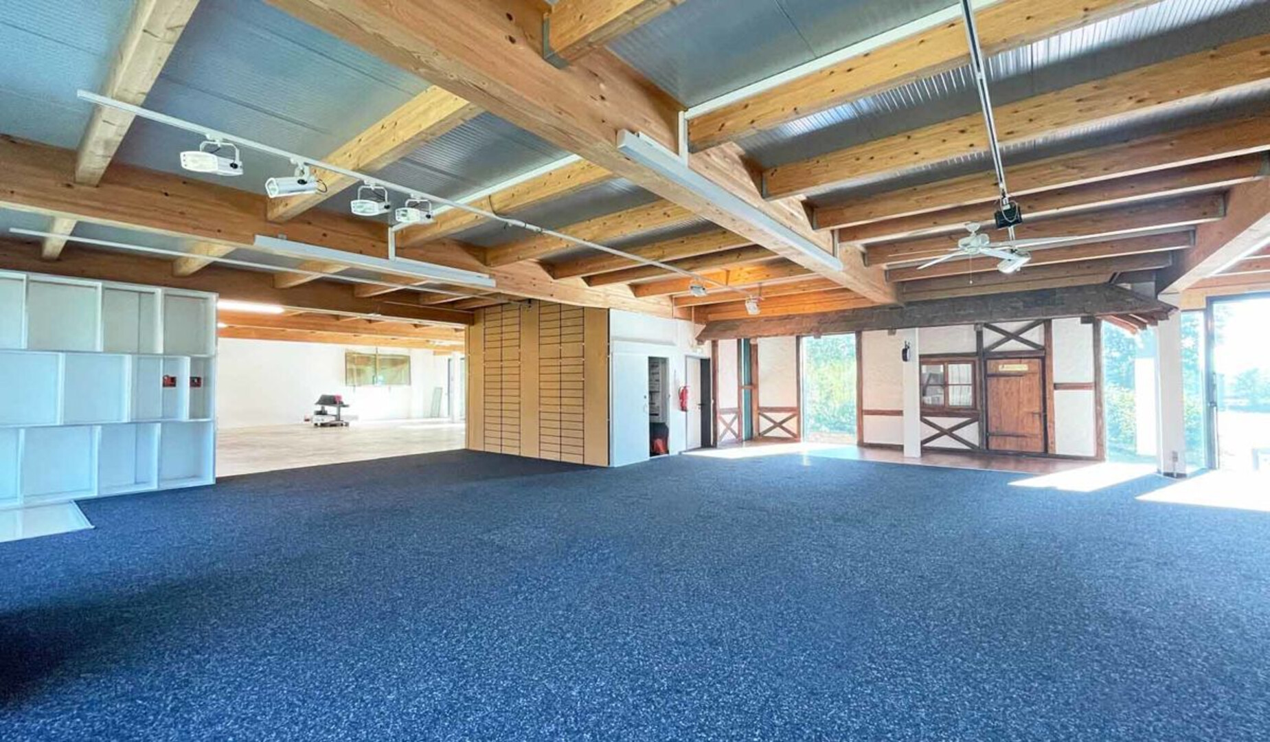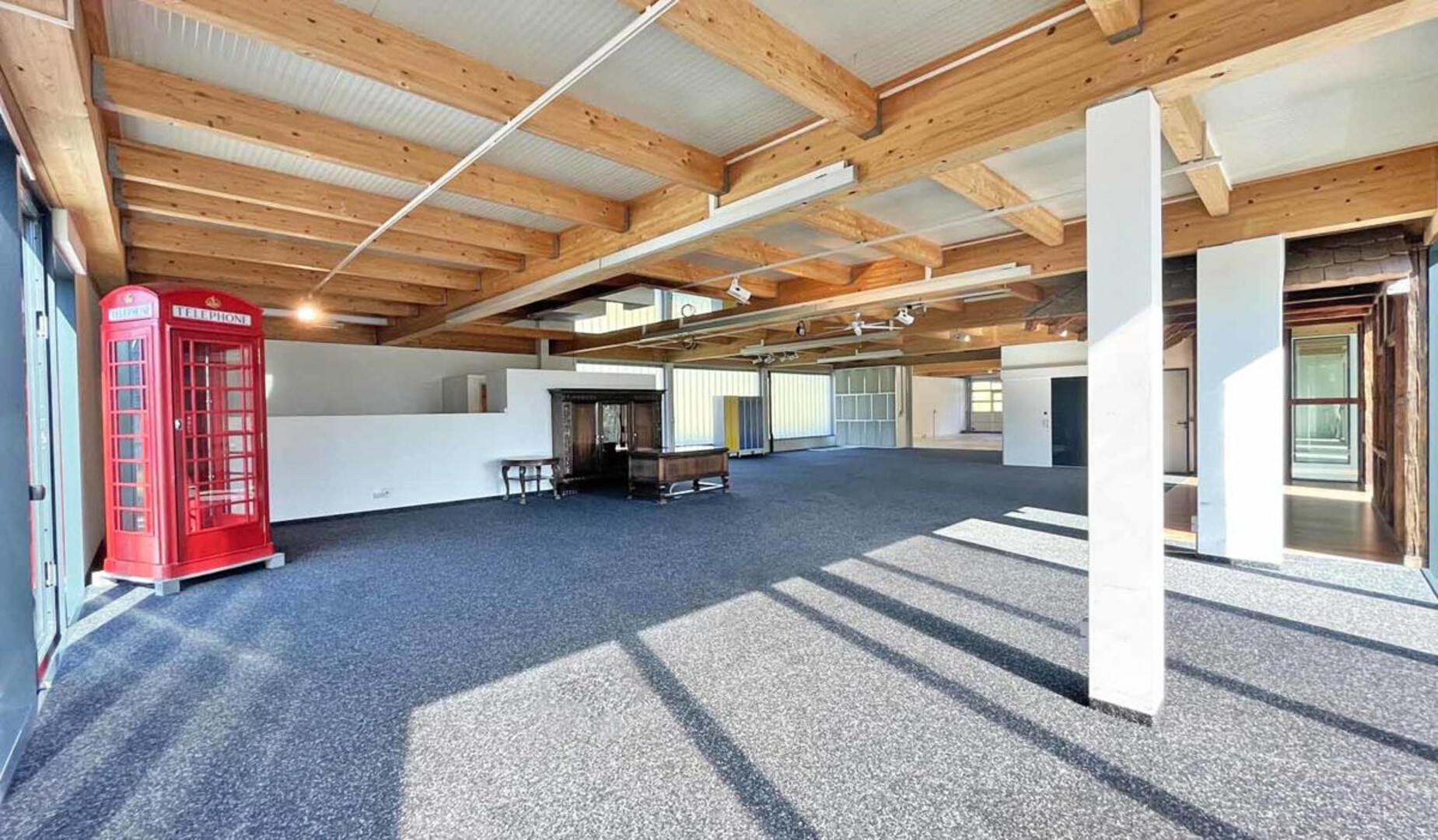 Die Halle umfasst eine Gesamtfläche von rund 435 m² und ist sowohl über einen Haupteingang im Erdgeschoss als auch über eine rückseitige Rampe bequem zugänglich. Zwei unterschiedliche Bereiche bieten vielseitige Nutzungsmöglichkeiten: Ein großzügiger, heller Raum mit Teppichboden und Fußbodenheizung und ein weiterer Raum mit Betonboden, der sich ideal als Lager, Werkstatt oder für technische Konzeptionierung eignet.