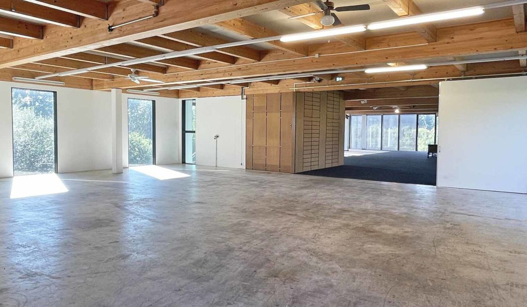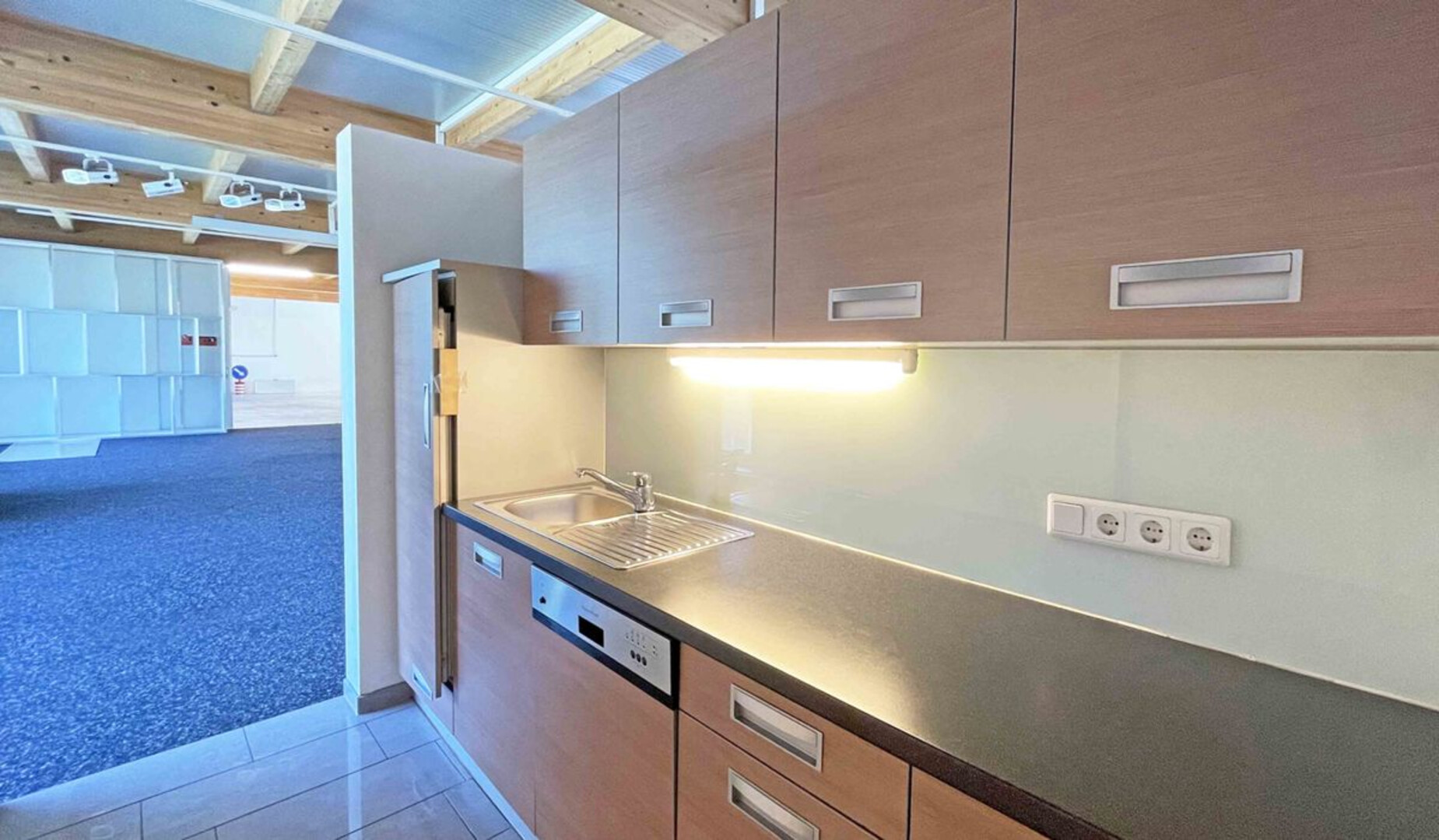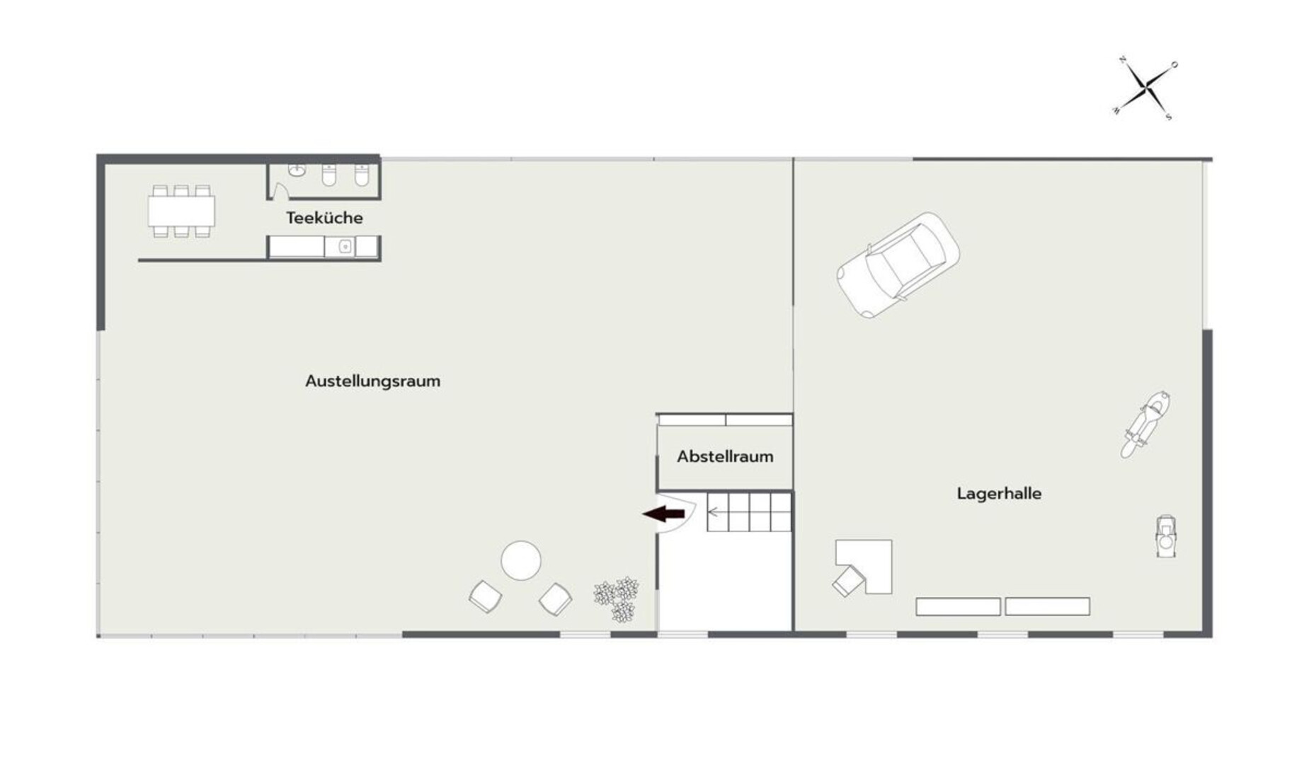 Die Halle umfasst eine Gesamtfläche von rund 435 m² und ist sowohl über einen Haupteingang im Erdgeschoss als auch über eine rückseitige Rampe bequem zugänglich. Zwei unterschiedliche Bereiche bieten vielseitige Nutzungsmöglichkeiten: Ein großzügiger, heller Raum mit Teppichboden und Fußbodenheizung und ein weiterer Raum mit Betonboden, der sich ideal als Lager, Werkstatt oder für technische Konzeptionierung eignet.