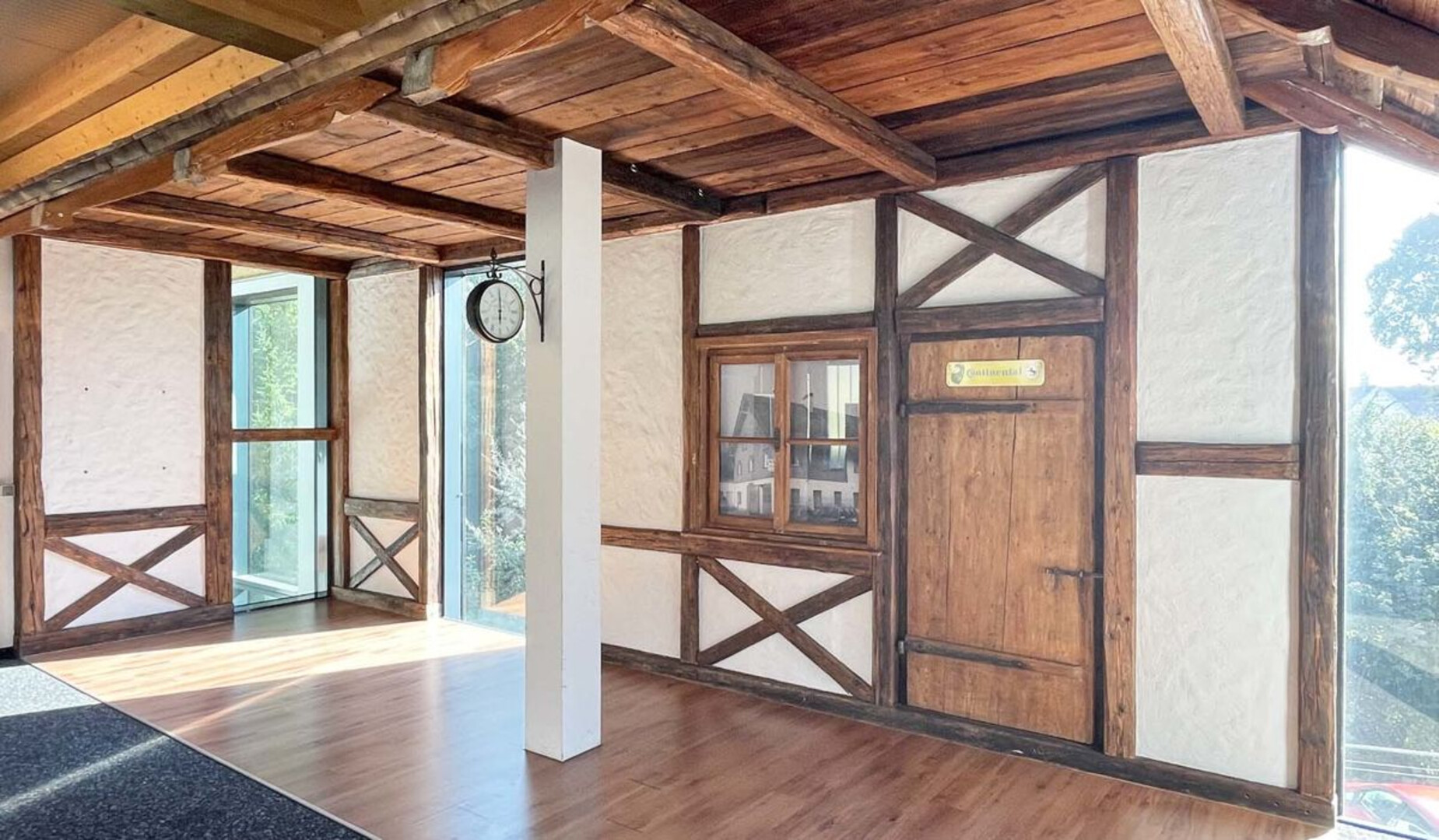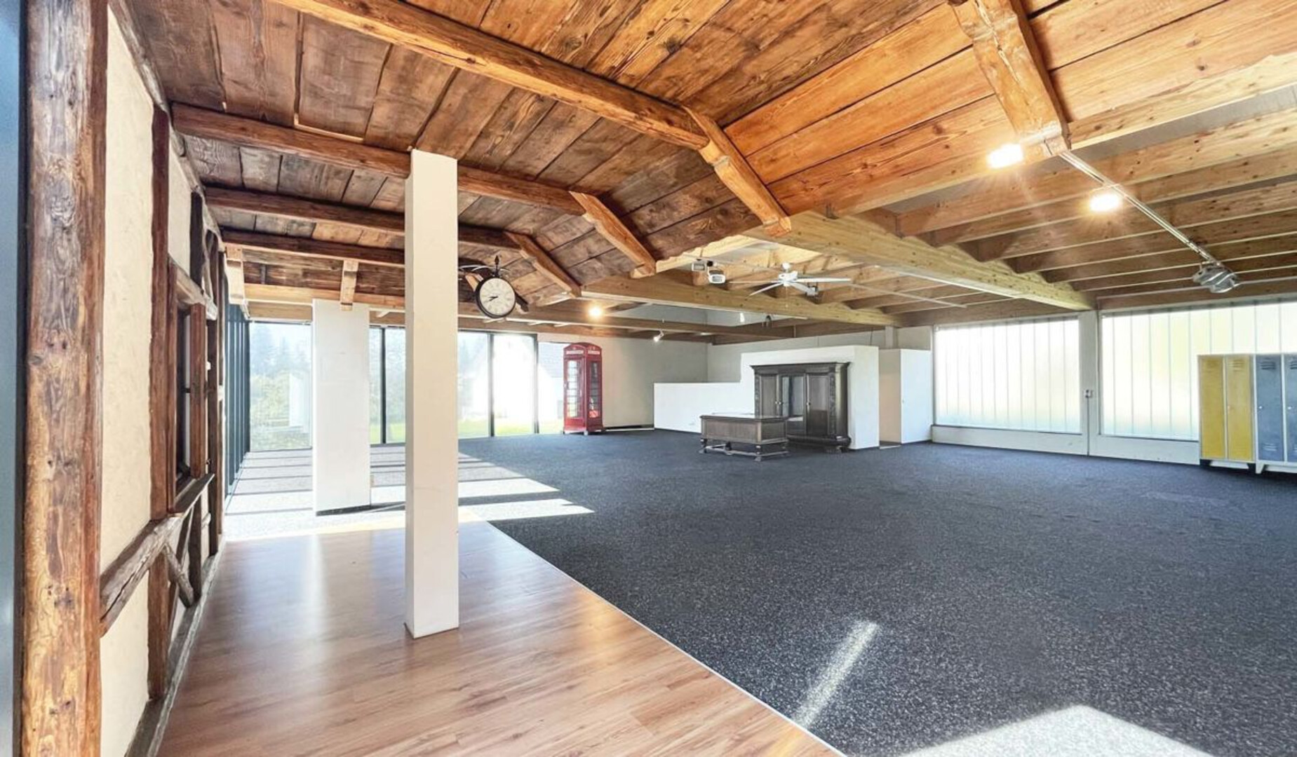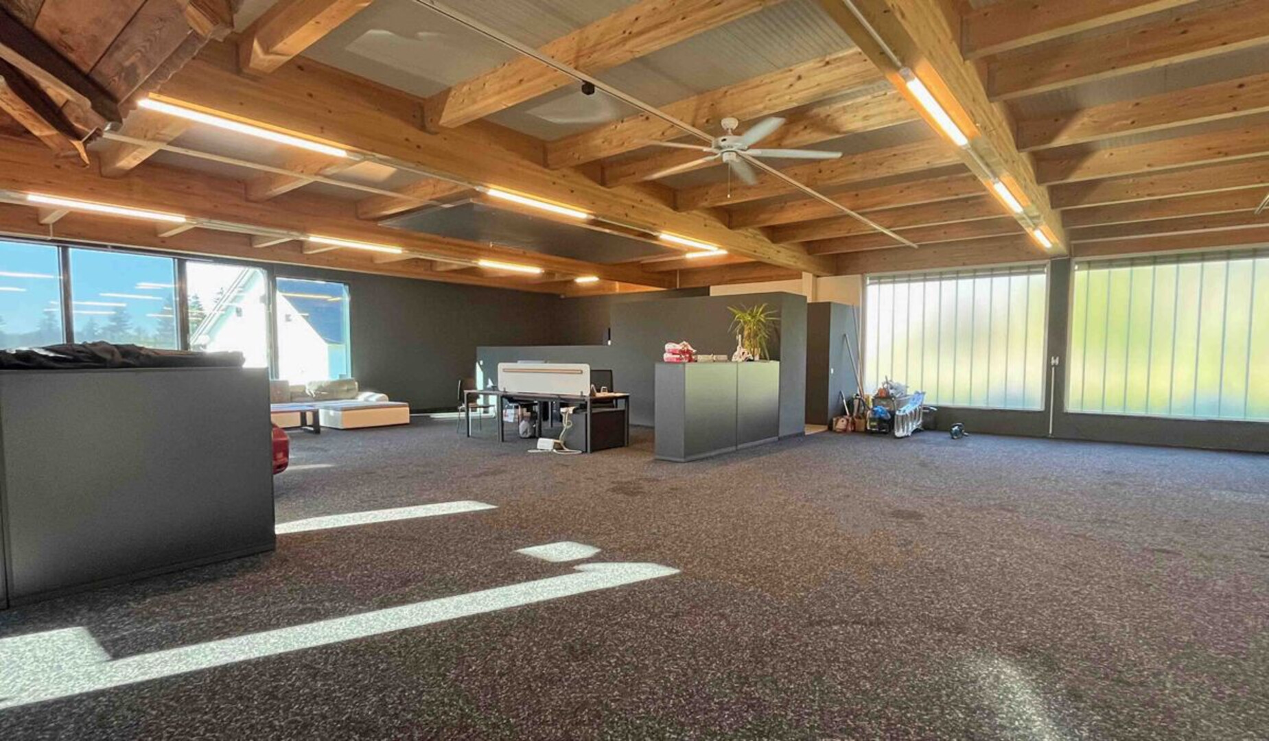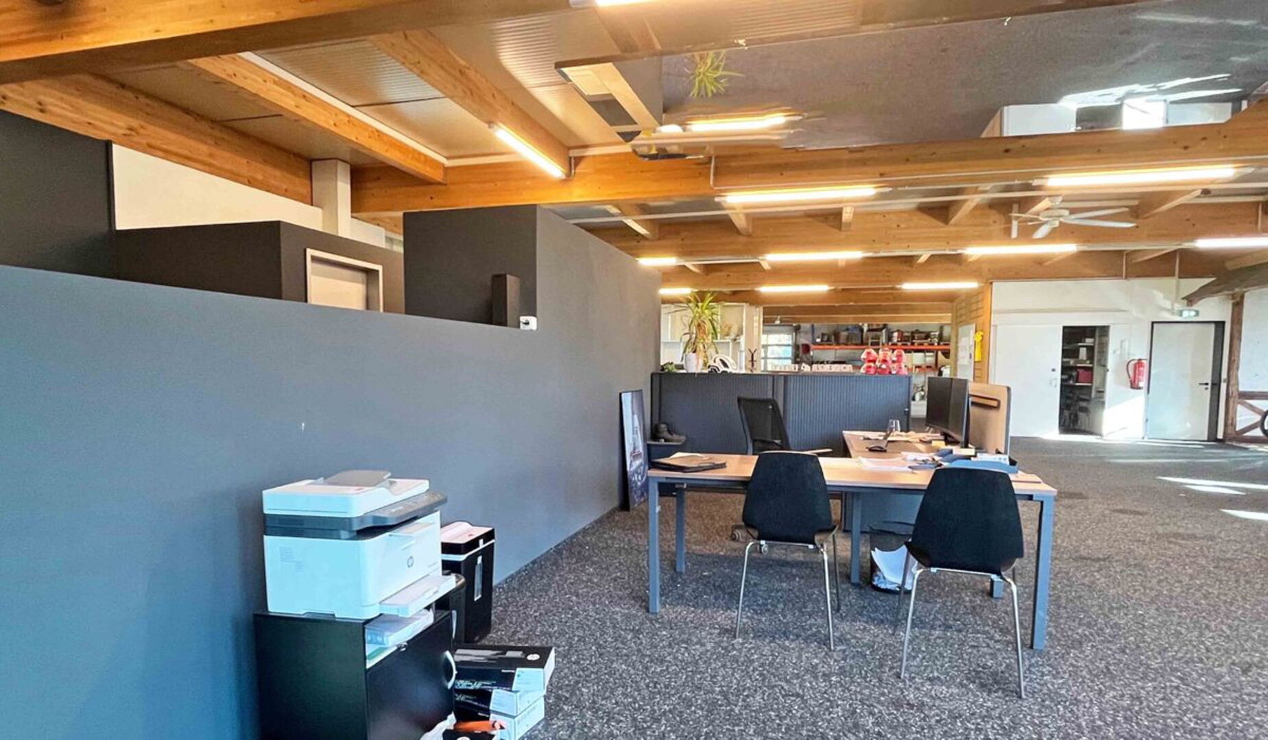Durch die offene Raumaufteilung, die rustikalen Holzbalken und die Kombination von Schaufläche und Arbeitsbereich entsteht ein kreativer und funktionaler Arbeitsplatz.