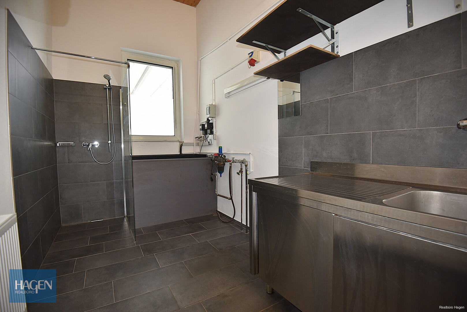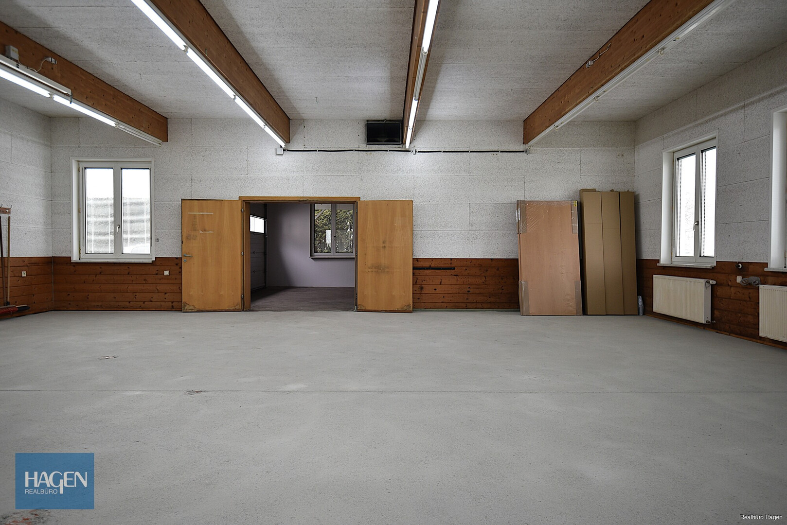 Die massiv gebaute Halle verfügt über ein breites Rolltor, einen separaten Eingang zu zwei Büros (ca. 12 m² & 17 m²) sowie eine WC-Anlage. Aus dem ursprünglichen Heizraum ist jetzt ein moderner Dusch- und Waschraum entstanden.