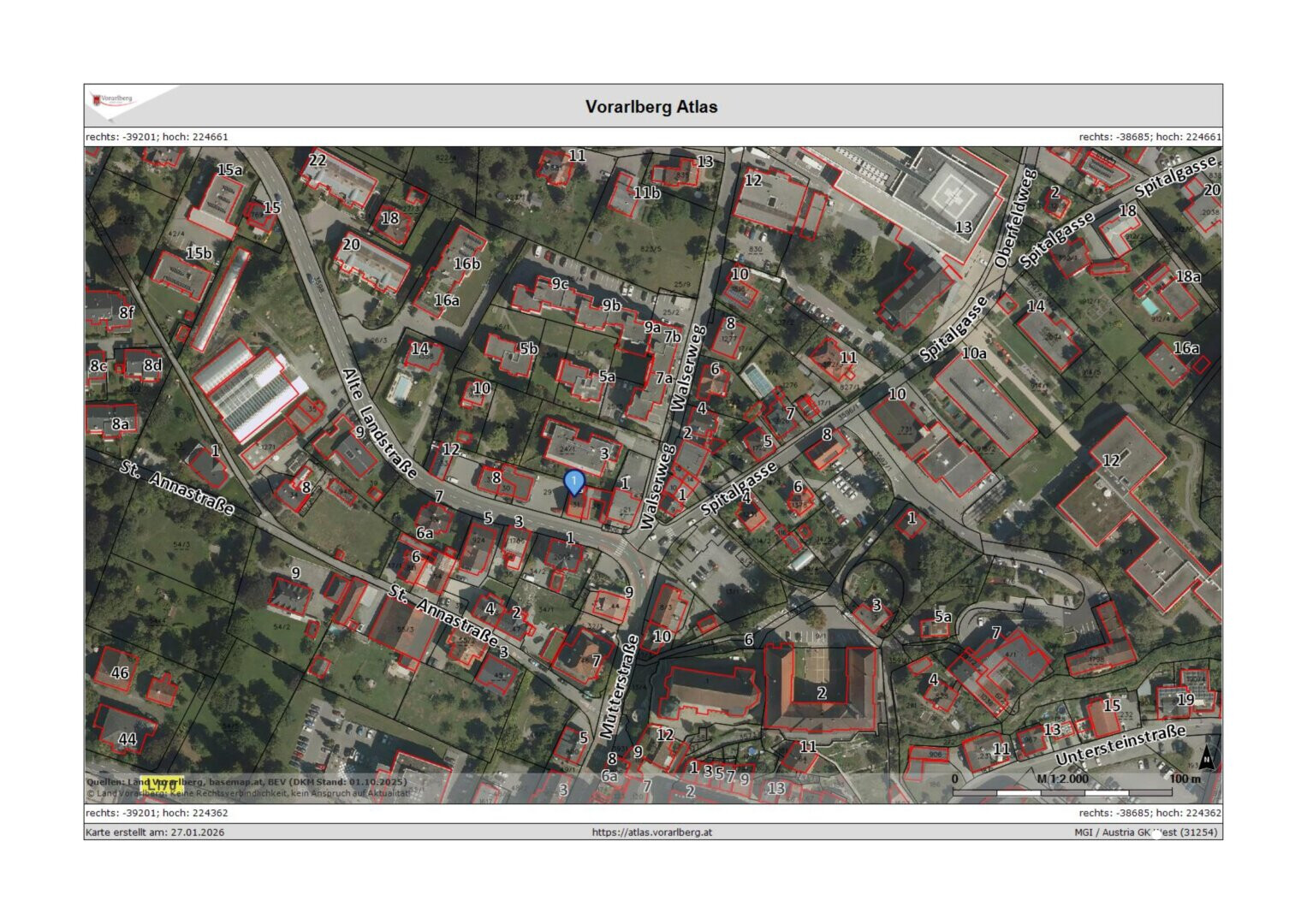 Die Liegenschaft befindet sich in gut erreichbarer Lage in Bludenz, Alte Landstraße 2. Der Standort liegt im städtischen Bereich mit rascher Anbindung an das örtliche und regionale Verkehrsnetz. Das Stadtzentrum von Bludenz sowie wichtige Versorgungseinrichtungen sind in wenigen Minuten erreichbar.