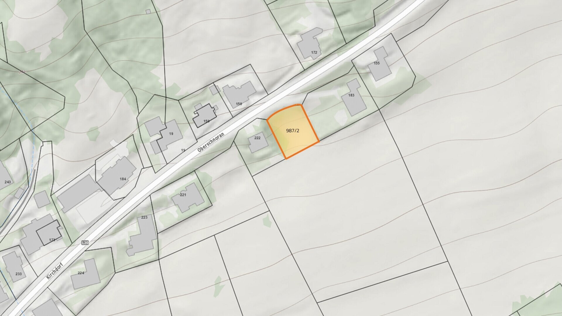 Das Grundstück mit der Nummer 987/2 umfasst eine Fläche von 597 m² und liegt in sonniger, unverbaubarer Aussichtslage.