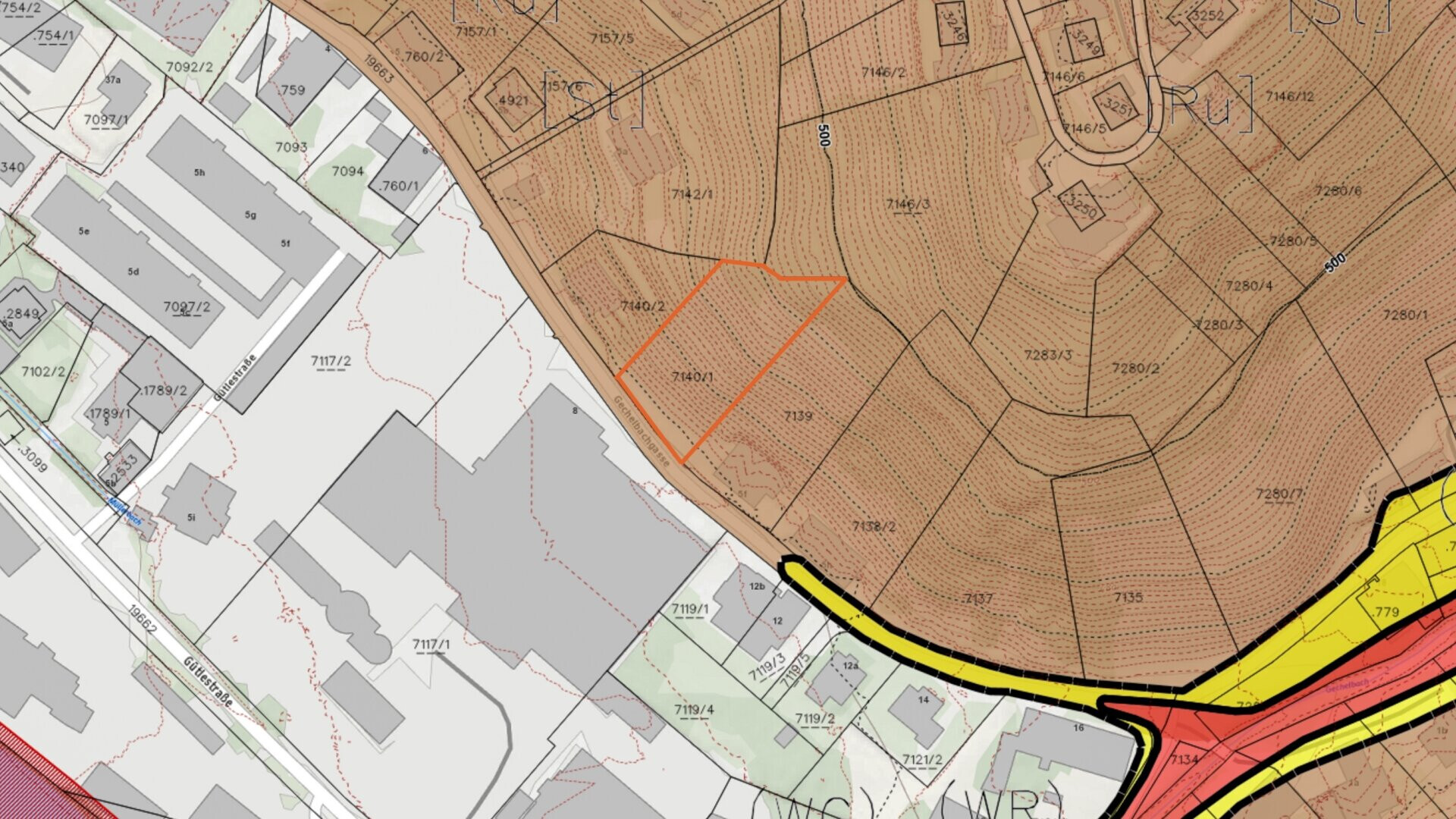 Laut Gefahrenzonenplan liegt das Grundstück im braunen Hinweisbereich. Dieser weist auf mögliche Gefährdungen durch Rutschung und Steinschlag hin. Eine Bebauung ist grundsätzlich möglich, erfordert jedoch entsprechende bauliche und planerische Maßnahmen.