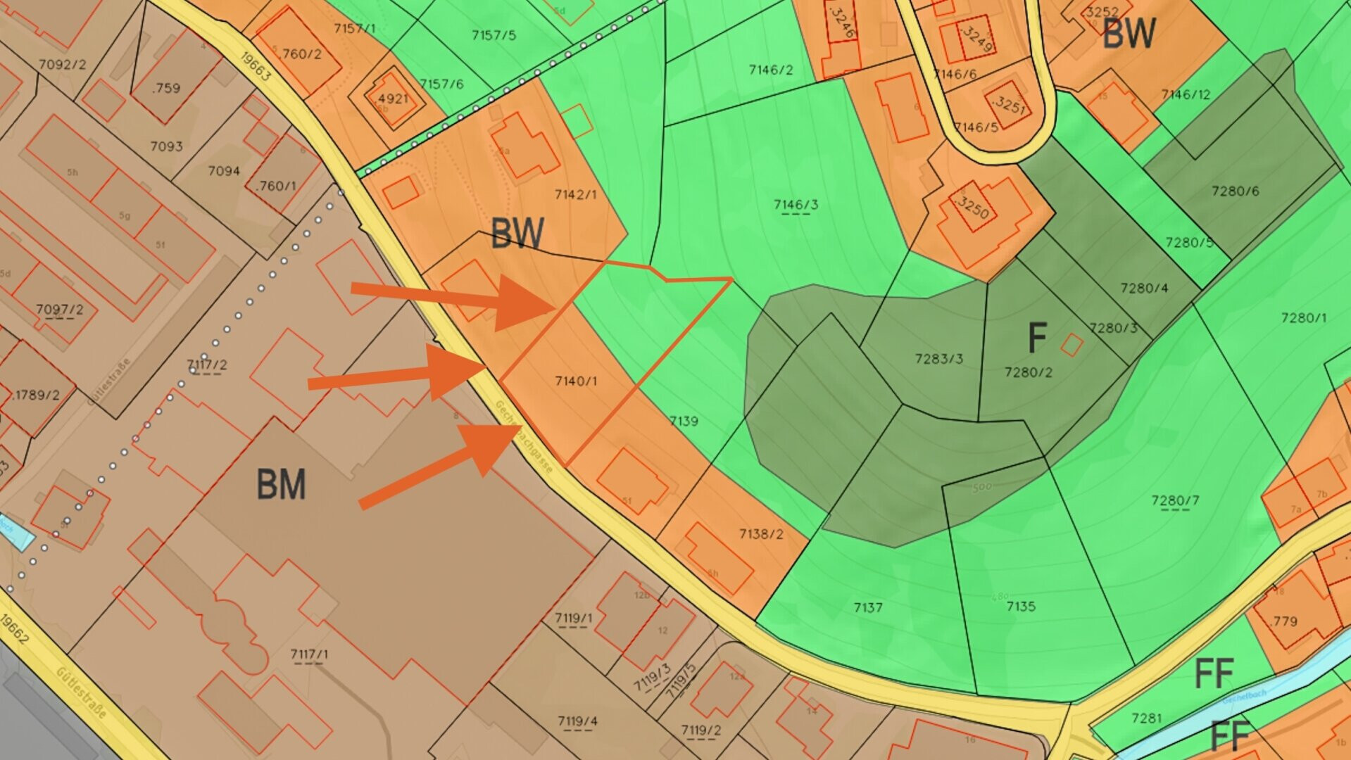Das Grundstück liegt in der Gechelbachgasse am Rand der Stadt Dornbirn und verbindet eine ruhige Hanglage mit einer guten Einbindung in das städtische Umfeld. Einrichtungen des täglichen Bedarfs, Schulen, öffentliche Verkehrsanbindungen sowie das Stadtzentrum von Dornbirn sind in kurzer Zeit erreichbar. Diese Kombination macht die Lage sehr interessant.