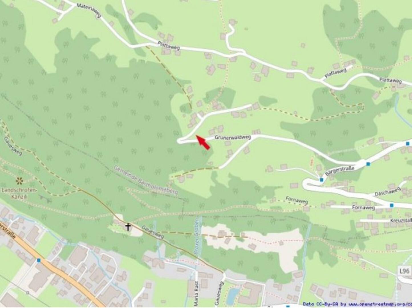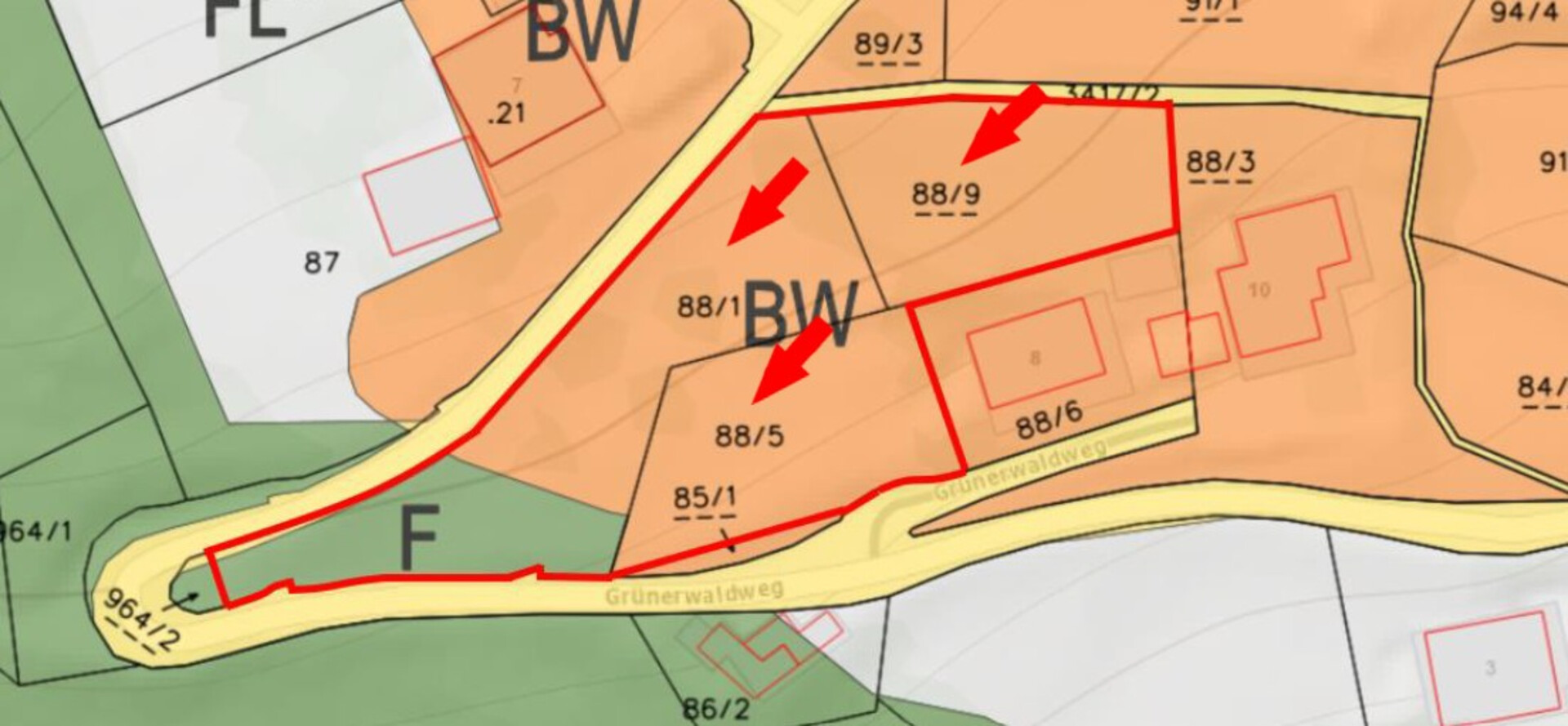 Zum Verkauf steht ein außergewöhnlich gelegenes Baugrundstück in begehrter Sonnenhanglage in Bartholomäberg auf einer Höhenlage von ca. 900 m ü. M.. Die Liegenschaft besticht durch ihre ruhige Umgebung, ganztägige Besonnung sowie eine eindrucksvolle Aussicht auf die umliegende Berg- und Tallandschaft. Das Grundstück setzt sich aus den Grundstücksnummern 88/1, 88/5 und 88/9 zusammen und weist eine Gesamtfläche von ca. 2.934 m² auf. Davon entfallen ca. 2.561 m² auf die Baufläche Wohnen, ergänzt durch eine Waldfläche von ca. 373 m², die den naturnahen Charakter der Liegenschaft zusätzlich unterstreicht. Die Nutzungsart ist Eigennutzung, was den privaten und exklusiven Wohncharakter des Grundstücks wahrt. Seitens der Gemeinde bestehen keine expliziten Vorgaben hinsichtlich Baunutzungszahl oder Geschosshöhe. Für Grundstücke ab einer Größe von 800 m² ist jedoch ein Antrag auf Baugrundlagenbestimmung erforderlich. Die Bebauung und Bauführung sollen sich harmonisch in den bestehenden Umgebungsbestand einfügen. Die Errichtung einer Wohnanlage ist nicht gestattet, wodurch eine lockere und hochwertige Bebauungsstruktur sichergestellt wird. Um die hervorragende Aussicht optimal auszunutzen, empfiehlt sich eine Bebauung im oberen Bereich des Grundstücks. Dadurch kann auch die Zufahrt bequem über die obere Straßenseite erfolgen. Gleichzeitig bleibt ausreichend Platz für die Schaffung von Parkflächen vorhanden. Der Grünerwaldweg, eine Abzweigung der Bärgerstraße, wird überwiegend ausschließlich von den dort ansässigen Bewohnern genutzt. Die Verkehrsbelastung ist entsprechend gering, was die ruhige und erholsame Wohnlage zusätzlich betont.
