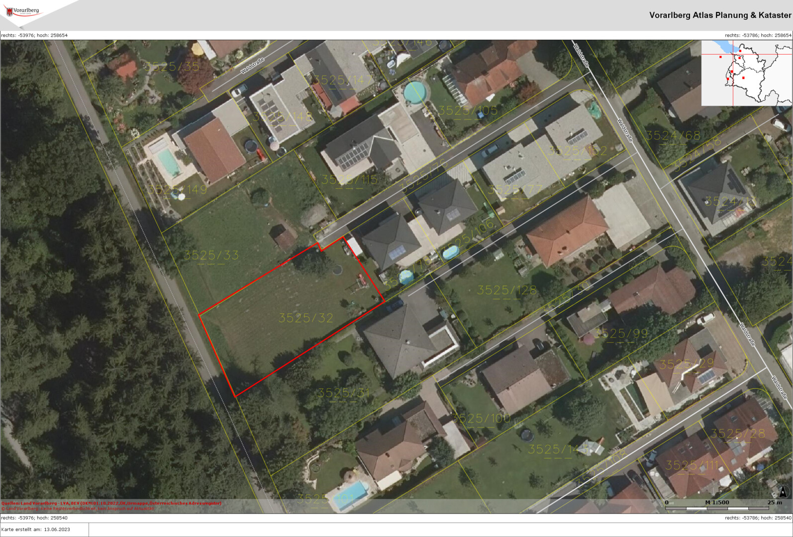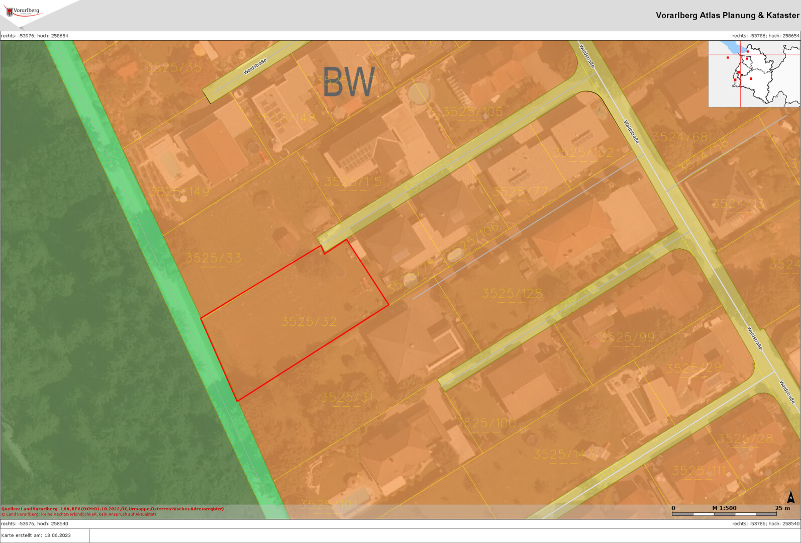Das gegenständliche Grundstück erstreckt sich über ca. 978 m² und ist im Flächenwidmungsplan der Gemeinde Höchst als Baufläche – Wohngebiet gewidmet.