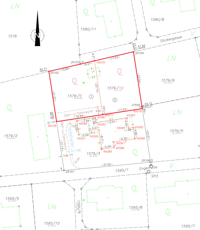 Das Geh-, Fahr- und Leitungsrecht, sowie Dienstbarkeit zur Errichtung von Parkplätzen auf GST 1579/3 sind grundbücherlich gesichert.