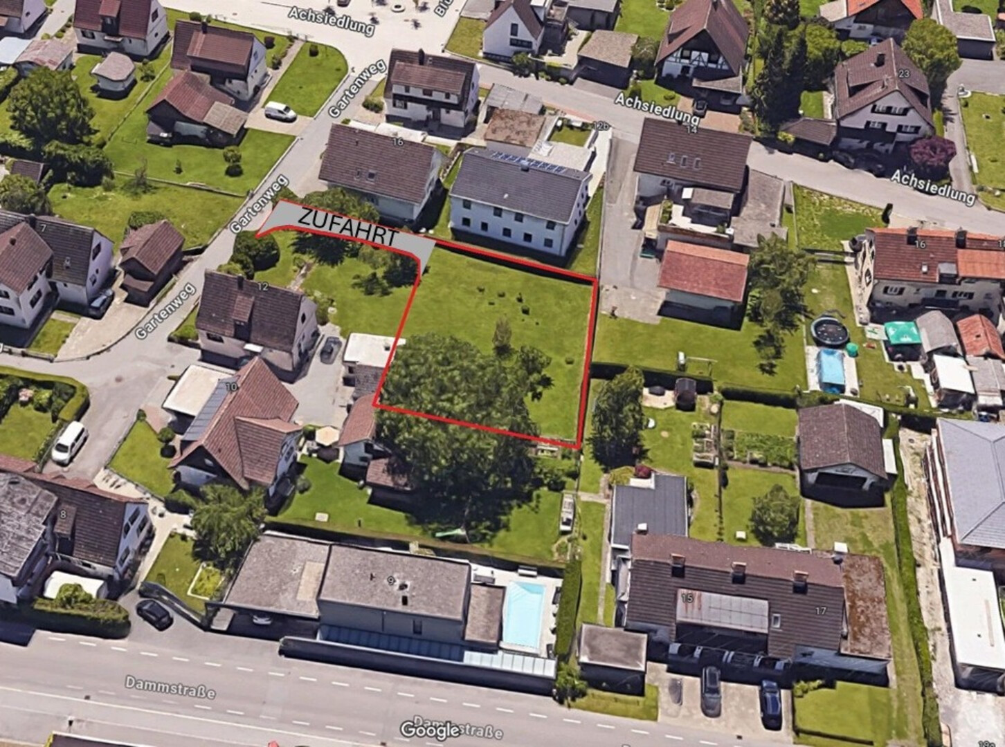Das Grundstück unterteilt sich in zwei Parzellen: eine Zufahrt mit ca. 90 m² sowie den eigentlichen Bauplatz mit rund 630 m². Die Zufahrt kann als private Spielstraße genutzt werden.
