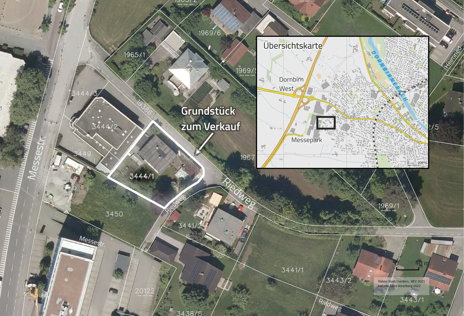 Zum Verkauf steht eine attraktive Liegenschaft in ruhiger Lage im Riedweg 24 in Dornbirn. Das Grundstück mit der Gst.-Nr. 3444/1 befindet sich in einer wenig frequentierten Gemeindestraße und überzeugt durch seine hervorragende Infrastruktur sowie die unmittelbare Nähe zum Messepark.