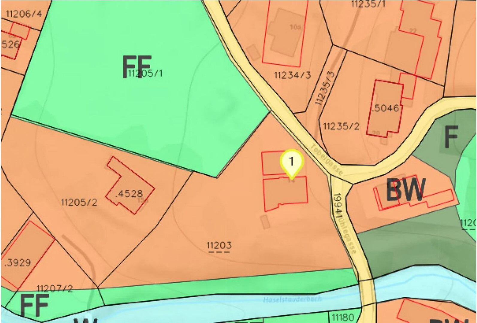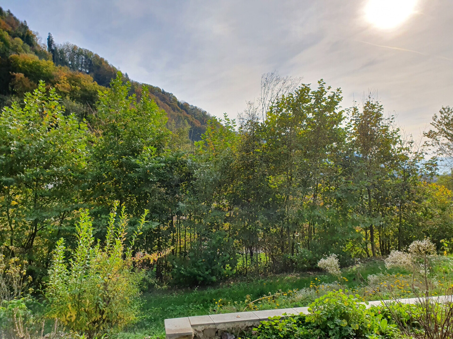 Ein besonderes Detail ist der sanft verlaufende Bach am Grundstücksrand, begleitet von einzelnen Bäumen – ein natürlicher Akzent, der das Grundstück aufwertet und ein ruhiges, idyllisches Wohngefühl schafft.