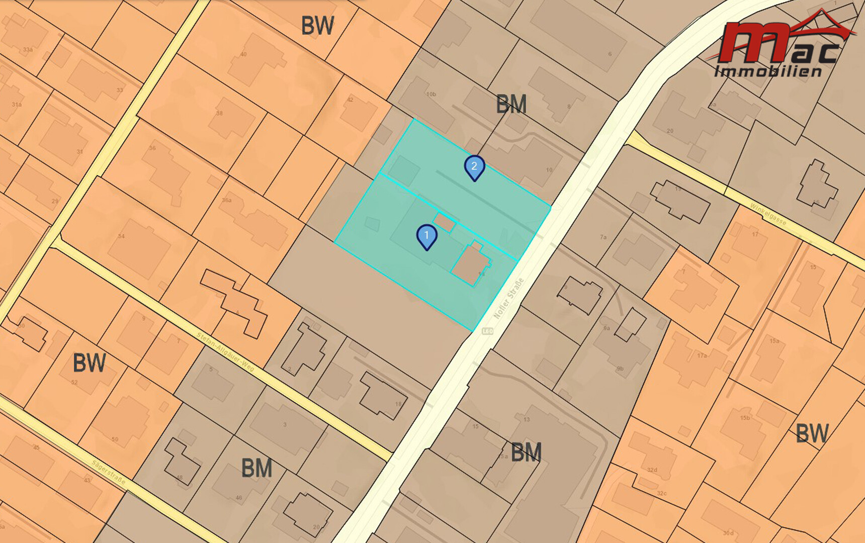 Als Baumischgebiet (BM) gewidmet bietet das Grundstück eine großzügige Baunutzungszahl, wodurch eine Bebauung mit bis zu drei Vollgeschossen möglich ist. BNZ 45 bis 60, HGZ 2 bis 3.