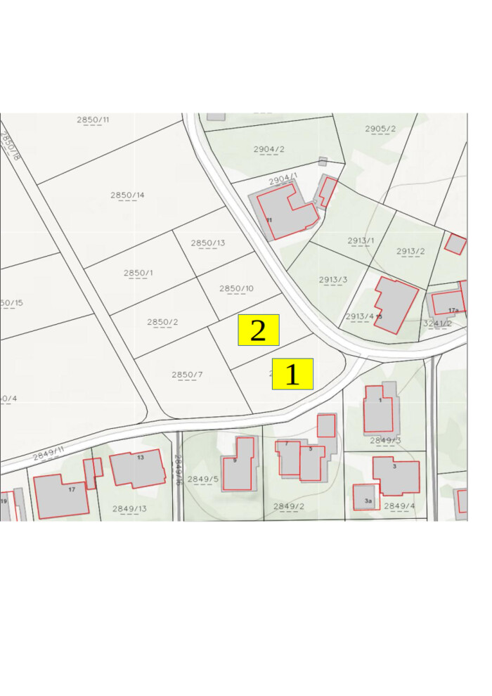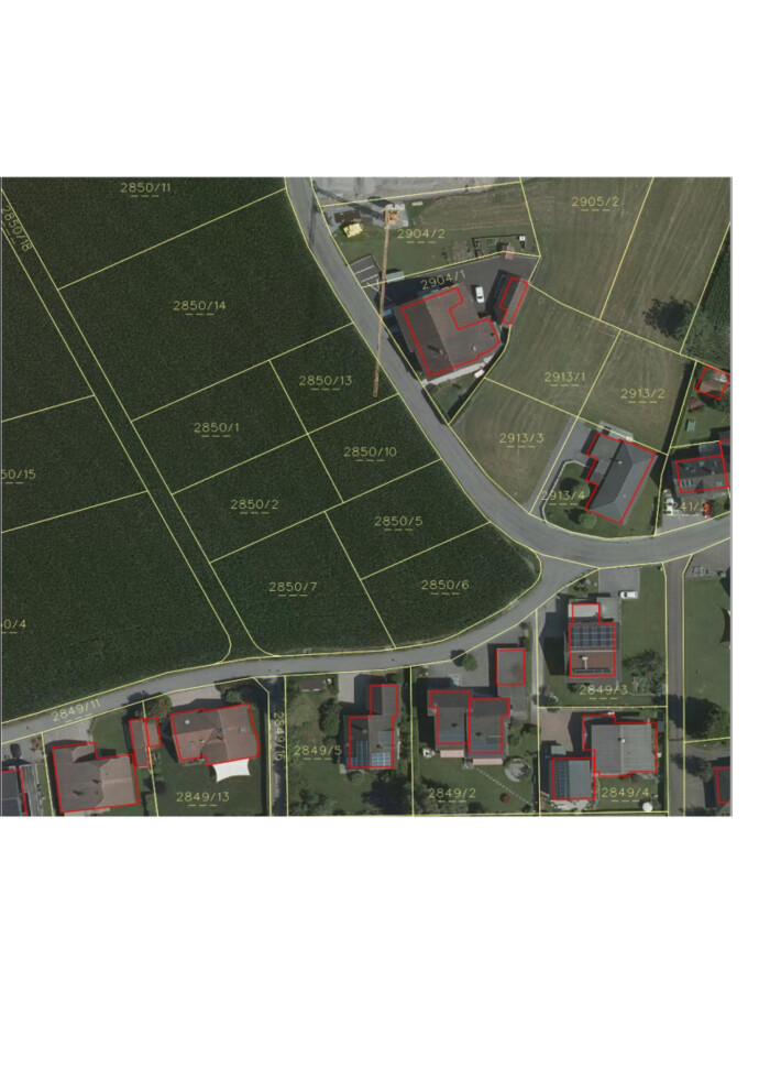 - Grundstück 1 (2850/6) mit 795 m², Widmung: Baufläche Wohngebiet; Ideal für 1-2 Einfamilienhäuser oder Doppelhaus, Preis VB 850 Euro/m2