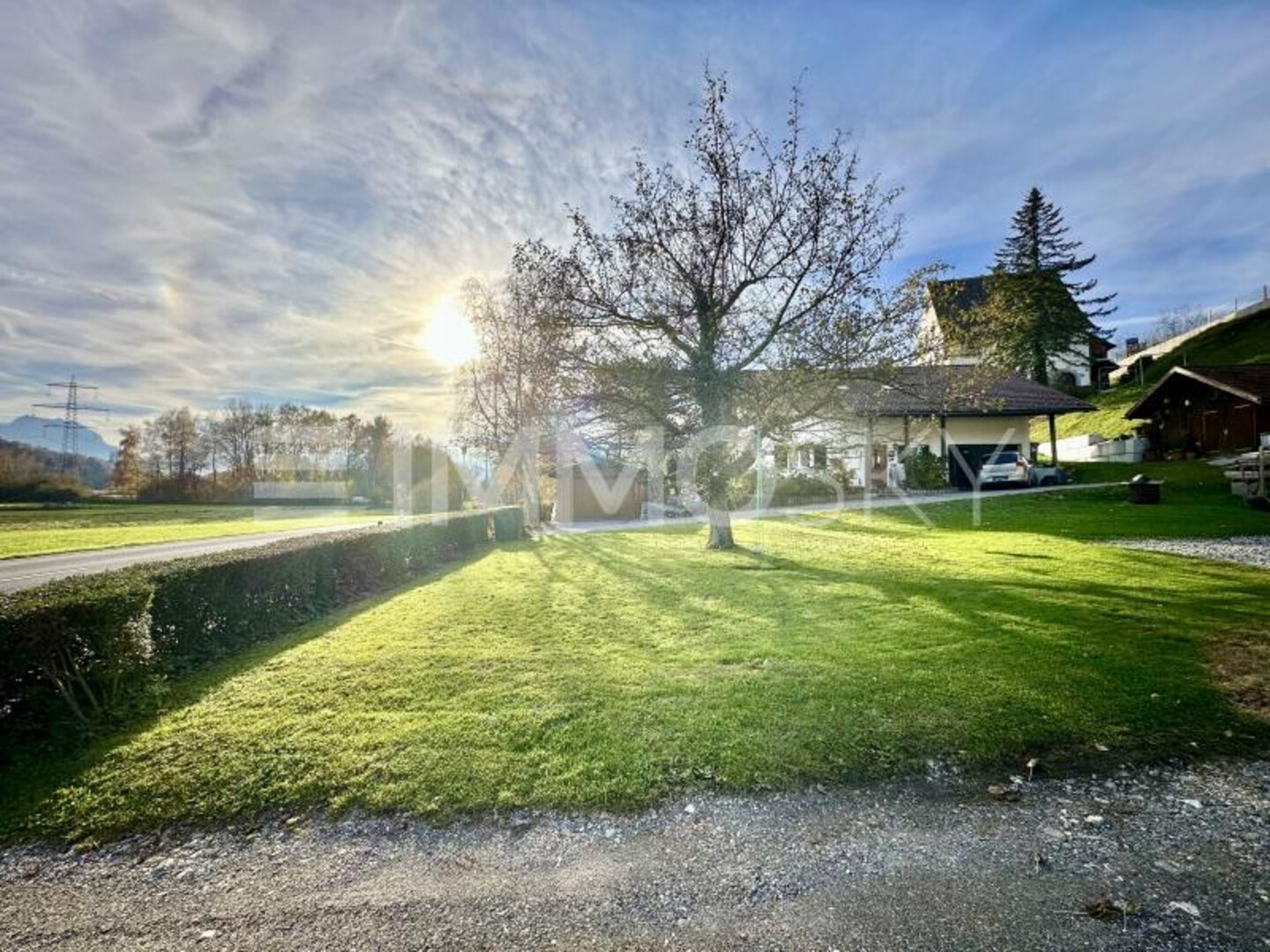 Auf dem leicht abfallenden Grundstück mit angrenzenden Einfamilienhäusern und Straße können Sie den Blick in die Natur genießen.
