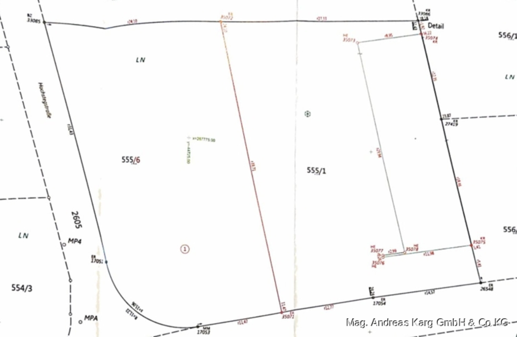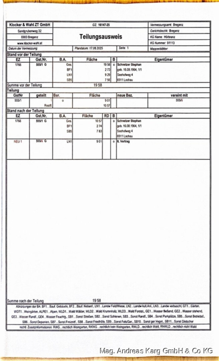 Das Grundstück, Flurstück 555/6 (EZ 1766, KG 91113 Hörbranz), ist ein Gewerbe- und Industriegrundstück (Betriebsgebiet BB I) in Hörbranz, Österreich. Es wurde kürzlich aus einem größeren Flurstück (Gst.Nr. 555/1) geteilt und ist weitgehend unbebaut, eben und mit geringem Baumbestand versehen. Es ist als baureifes Land eingestuft und eignet sich hervorragend für gewerbliche Entwicklung. Alle notwendigen Anschlüsse sind vorhanden. Entlang der östlichen Grenze zum Flurstück 555/1 befindet sich ein Maschendrahtzaun. Das Grundstück hat eine rechteckige Form mit einer Abrundung nach Süd-Westen und einen guten Baugrund. Eine Dienstbarkeit für Gehen und Fahren zugunsten des Zugangs zur Tiefgarage des Flurstücks 555/5 ist im Grundbuch eingetragen.