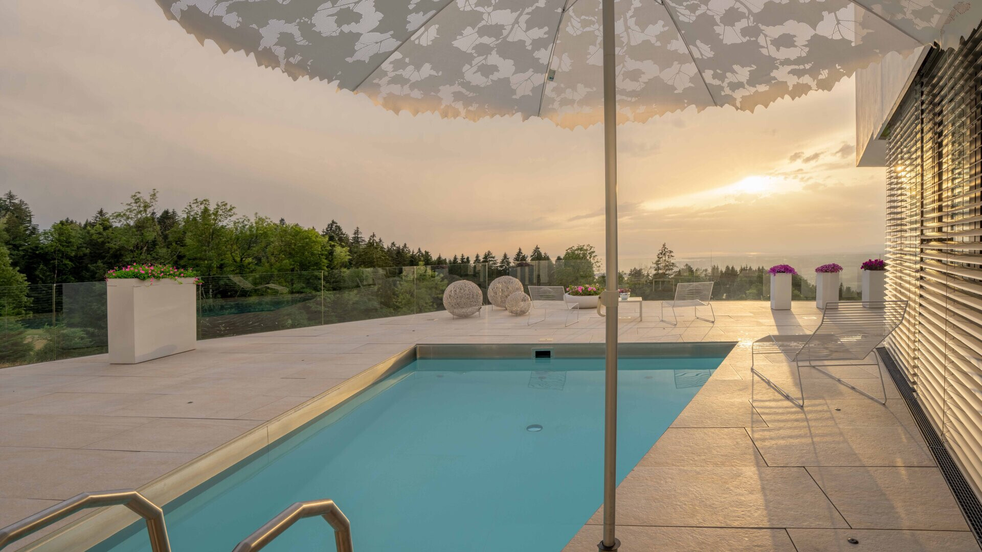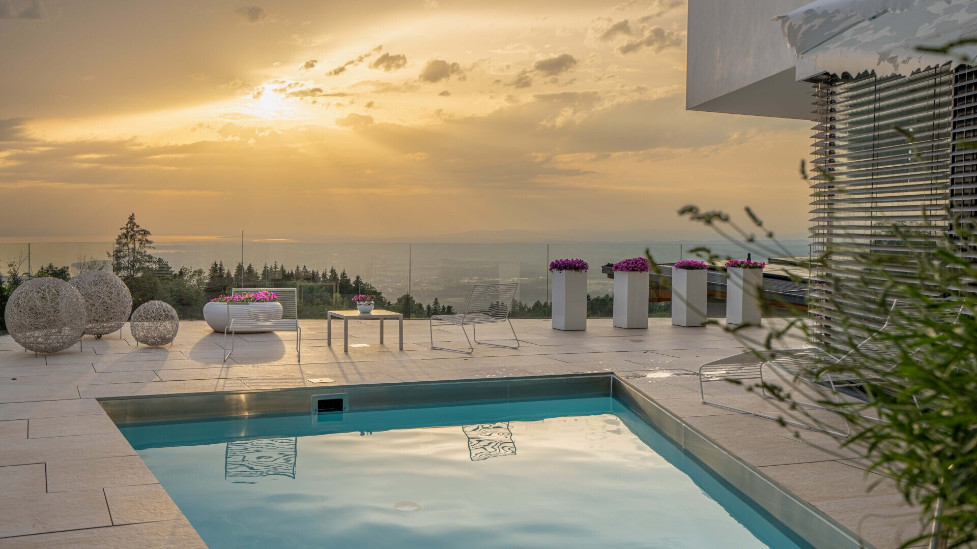 Im Eingangsbereich erwartet Sie bereits der freie Blick über den Pool hin zum Bodensee!
