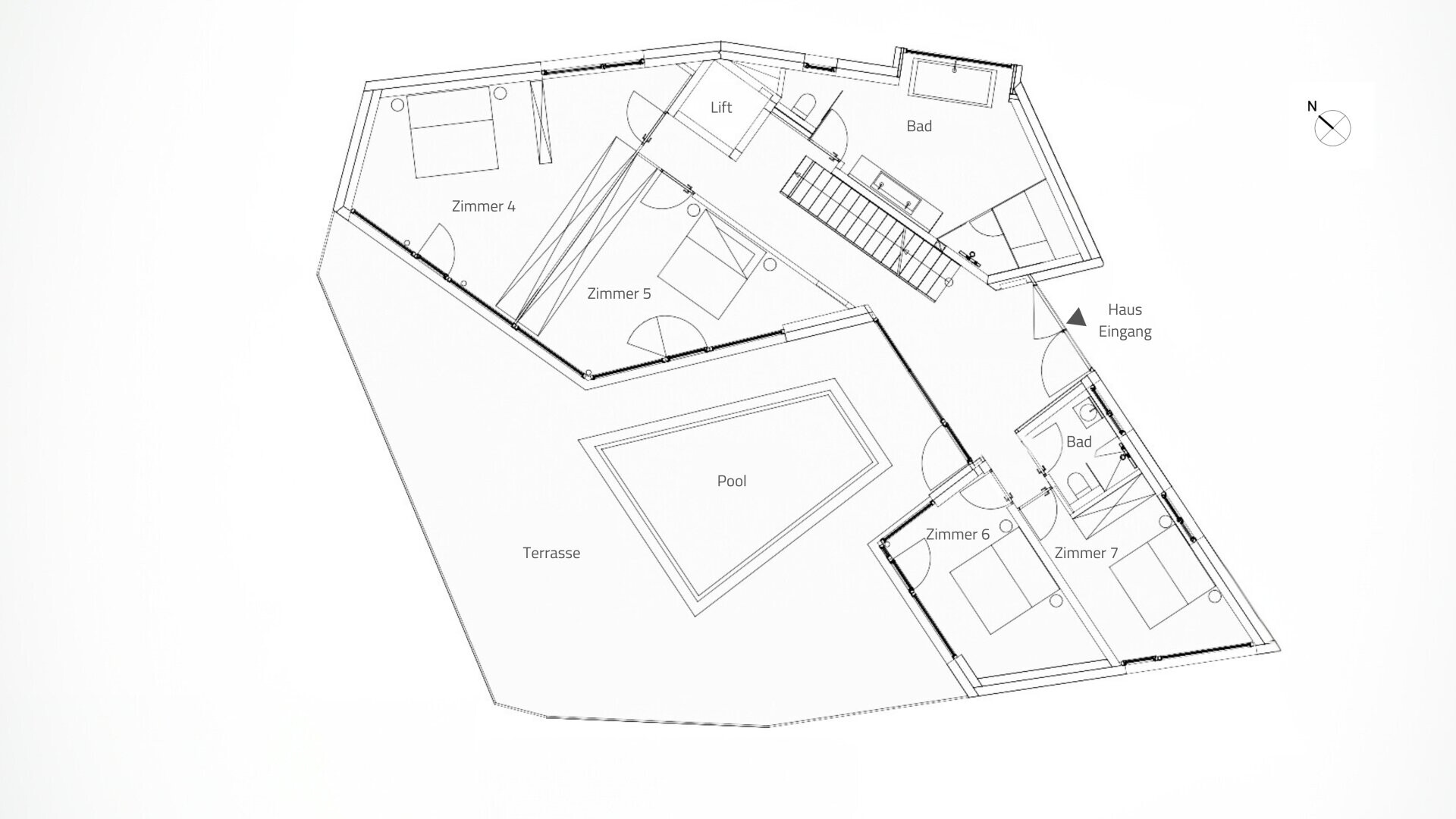 Jede Wohnung hat einen unabhängigen, separaten Eingang, was durch die Hanglage des Objekts bestens ermöglicht wird. Der Zugang zu Top 1 befindet sich nordseitig, während sich der Zugang zu Top 2 (Penthouse) auf der Ostseite befindet. Über die Garage sind beide Einheiten mit dem Lift erreichbar.
