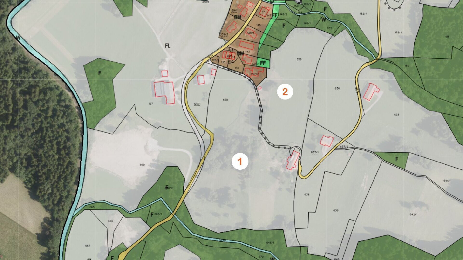 Grundstück 2 umfasst rund 3,9 Hektar und bildet den zentralen Teil des Anwesens. Auf diesem Grundstück befindet sich das Mehrfamilienhaus.