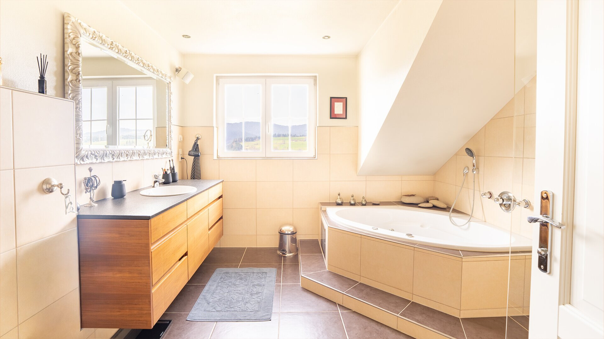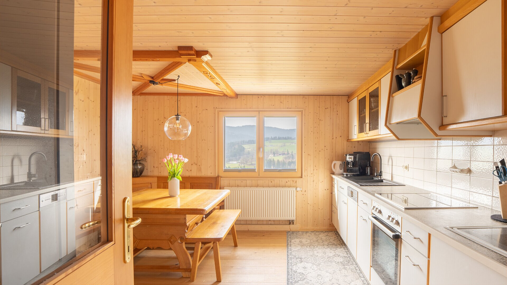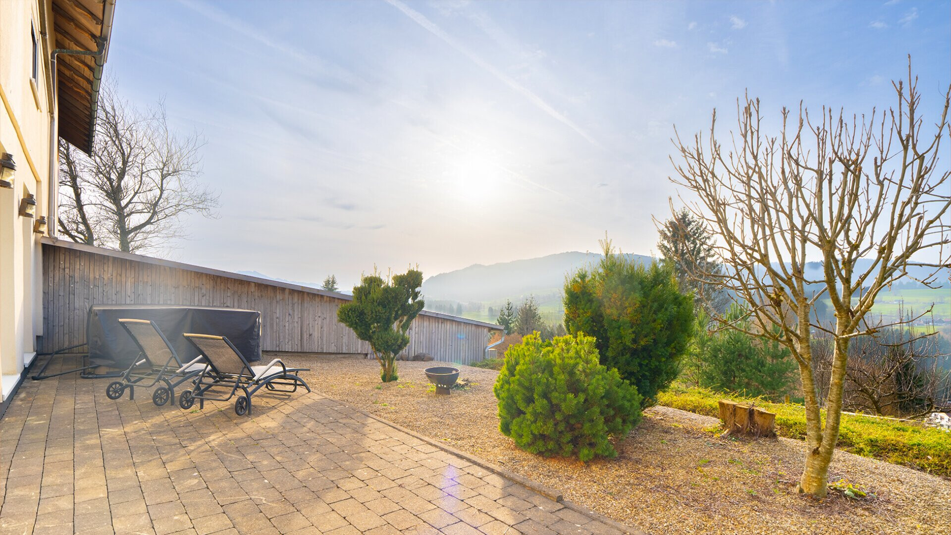 Die erhöhte Lage sorgt für eine schöne Aussicht über die Landschaft. An klaren Tagen reicht der Blick bis zum Säntis und unterstreicht die besondere Lage dieses Standortes.