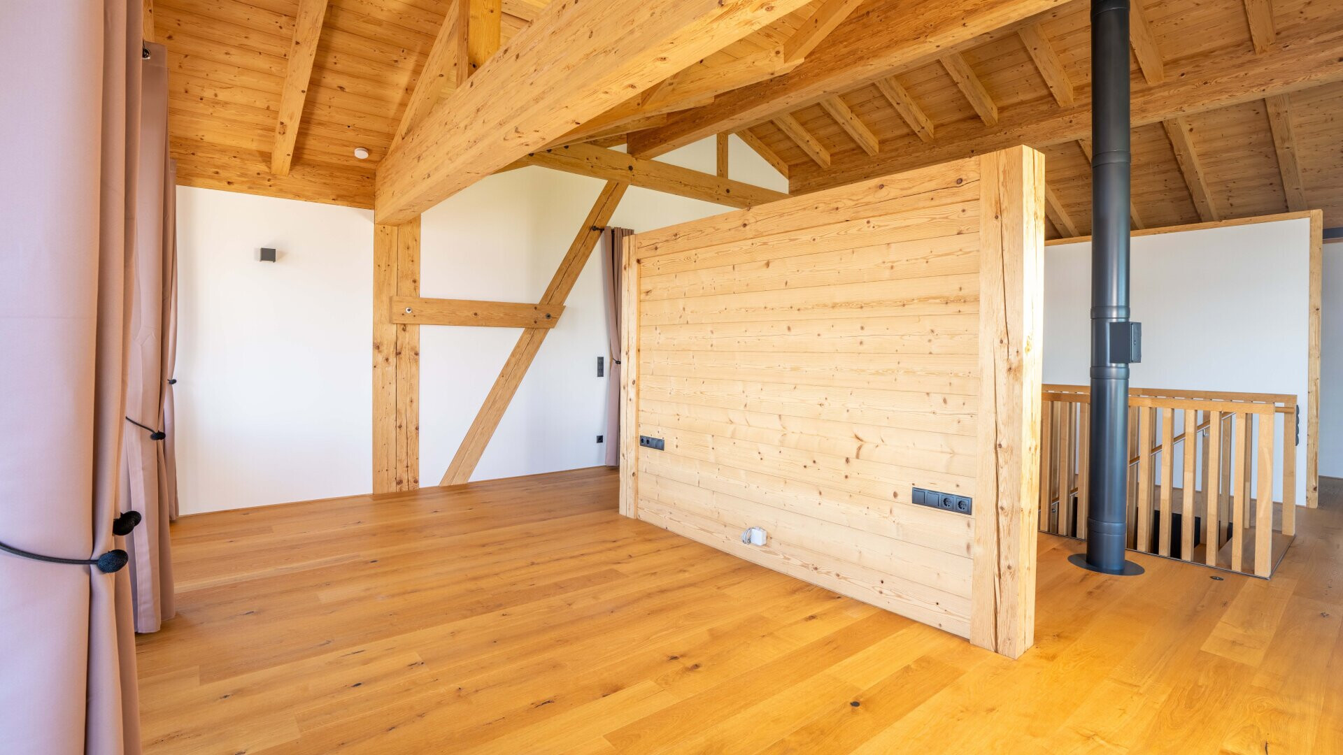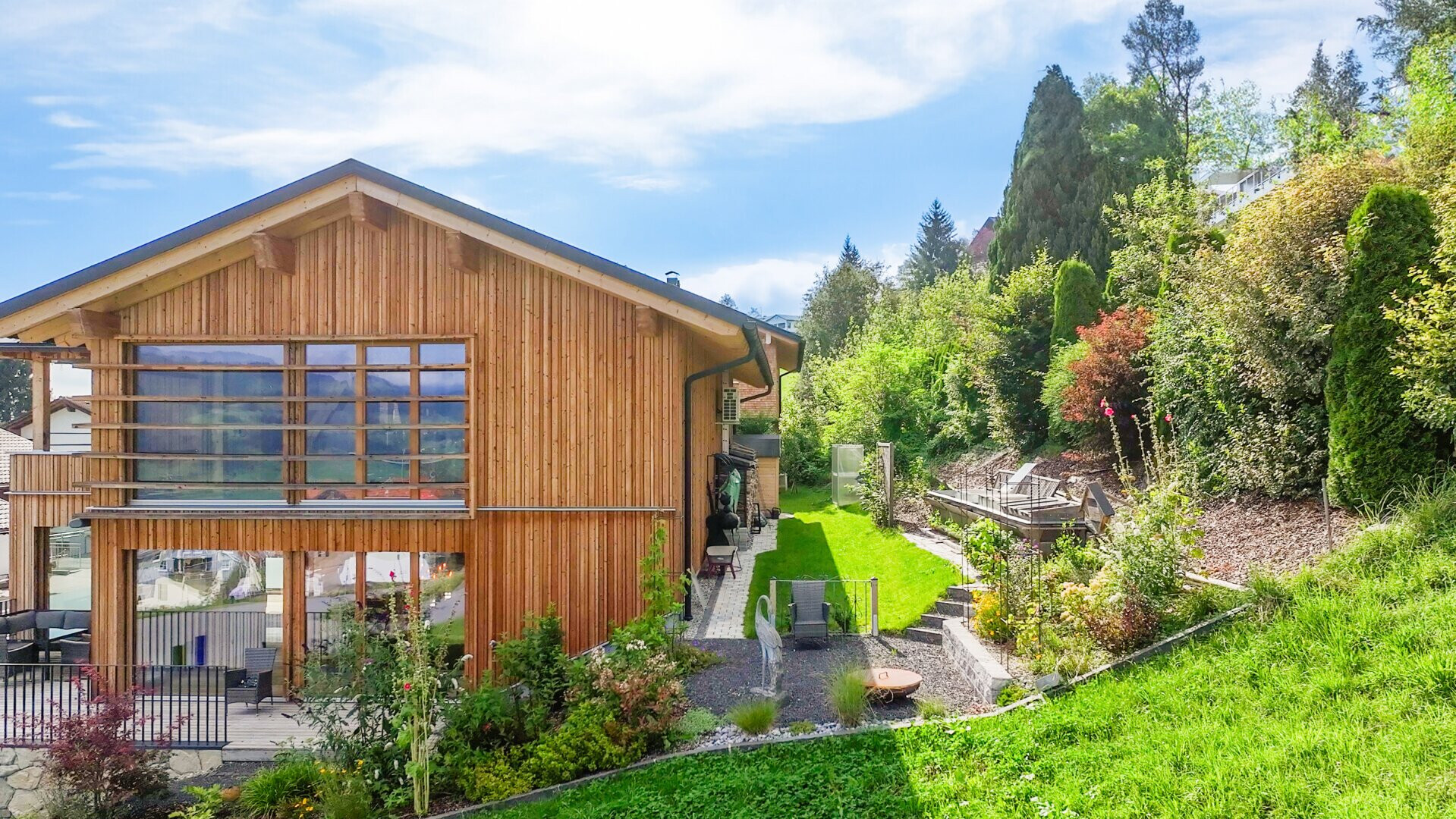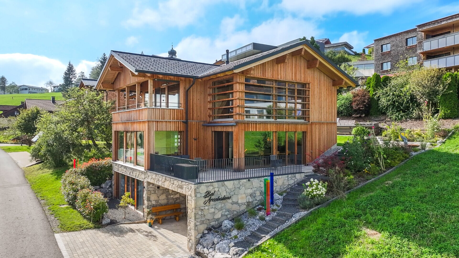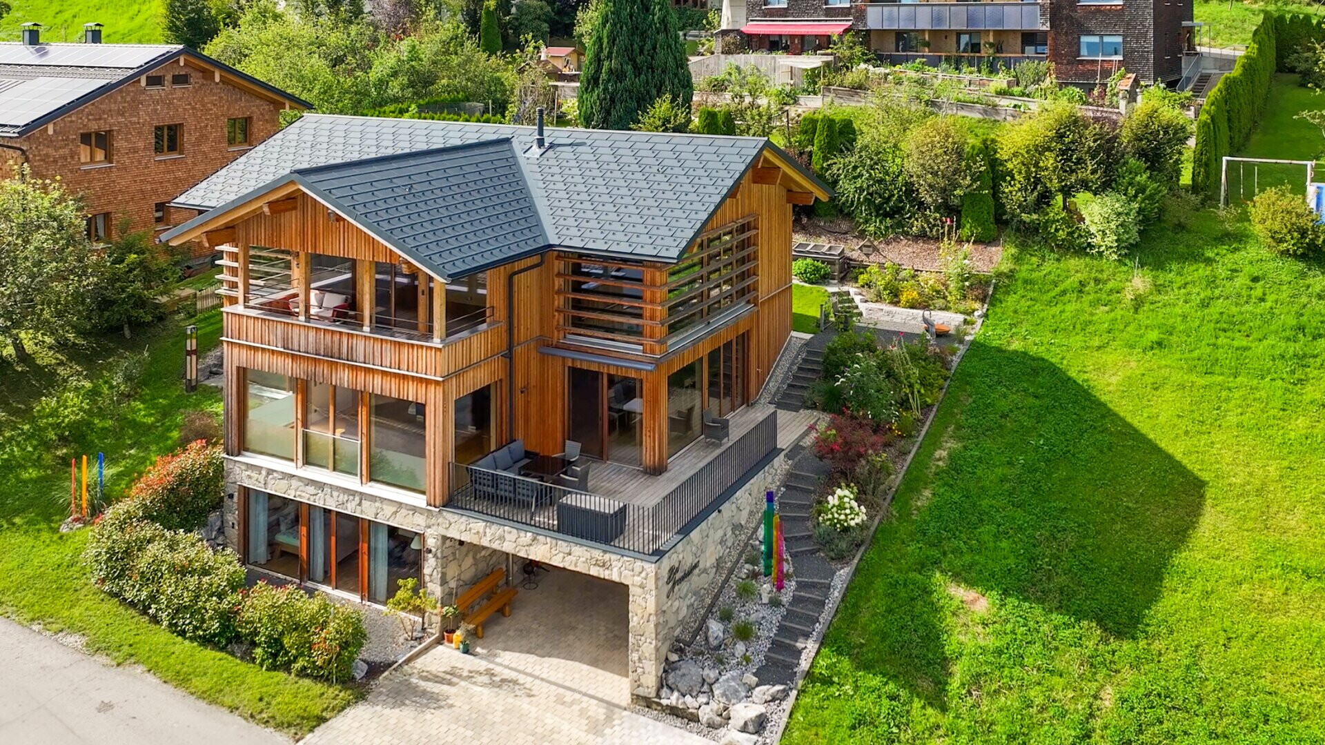 Das Chalet ist ein Holzhaus, das nach Süden ausgerichtet ist. Die großzügigen, bodentiefen Fensterfronten sorgen für ein lichtdurchflutetes Ambiente und bieten Fernblick sowie beeindruckende Bergpanoramen. Der offene Grundriss verleiht dem Haus eine moderne und großzügige Atmosphäre. Ein besonderer Blickfang ist der aufwändig mit Naturstein verblendete Sockel sowie das teils verwendete Altholz.