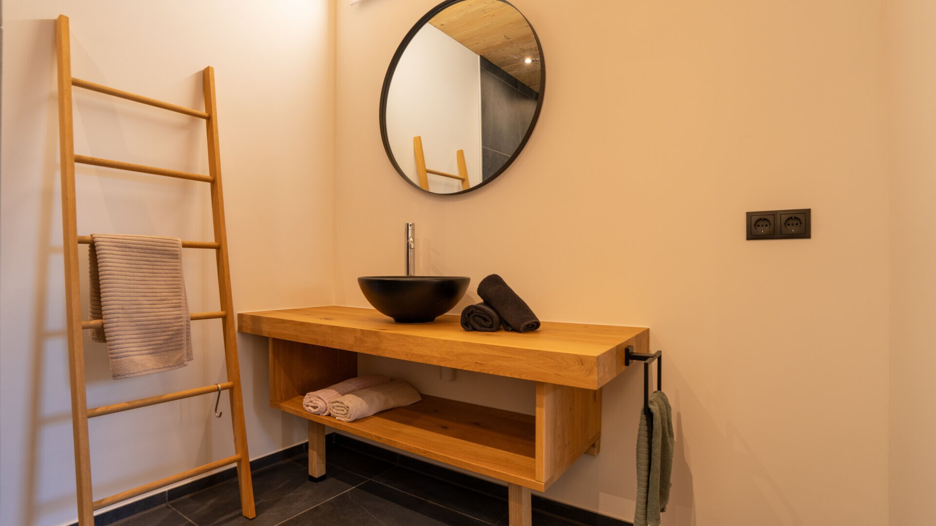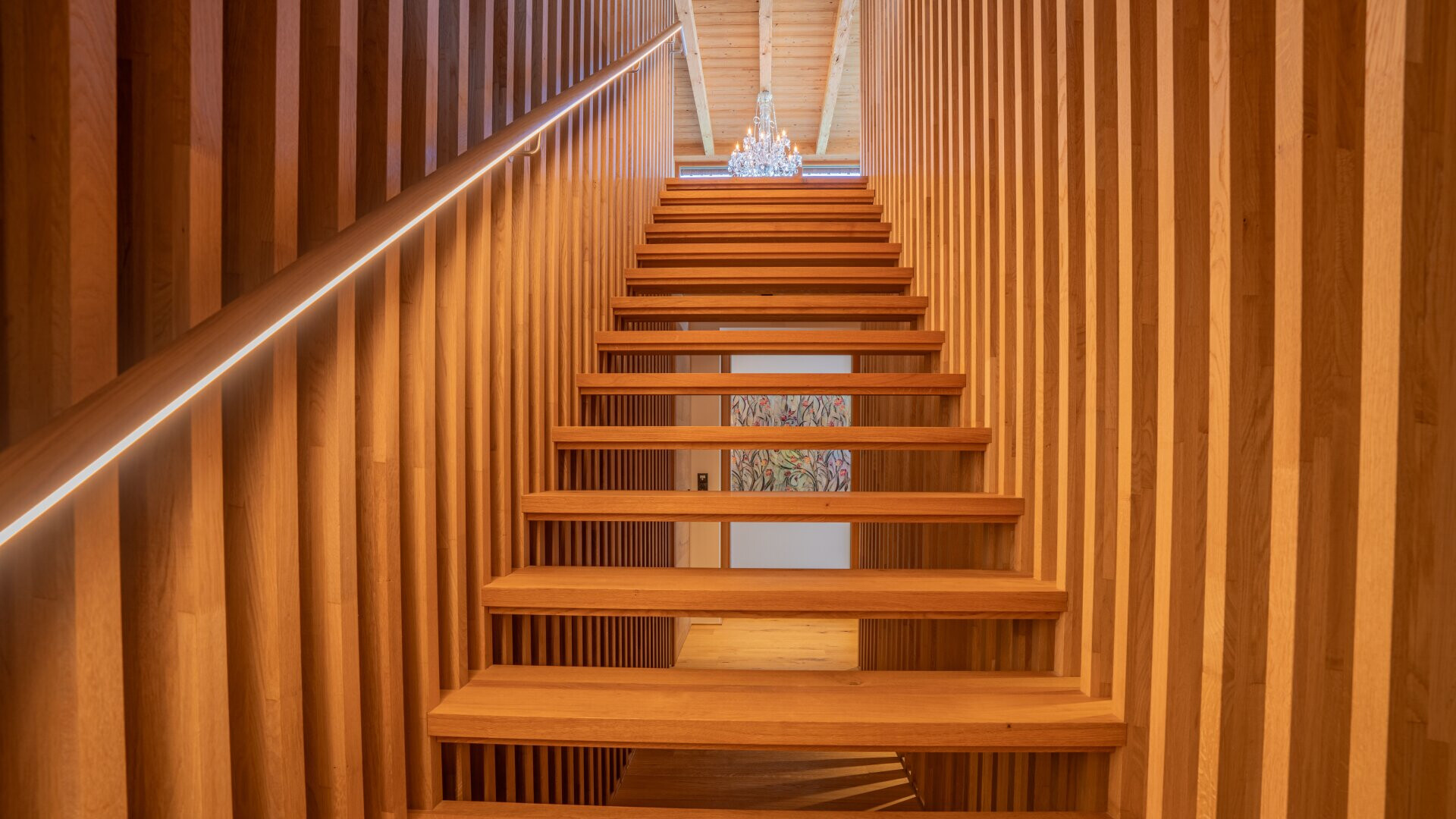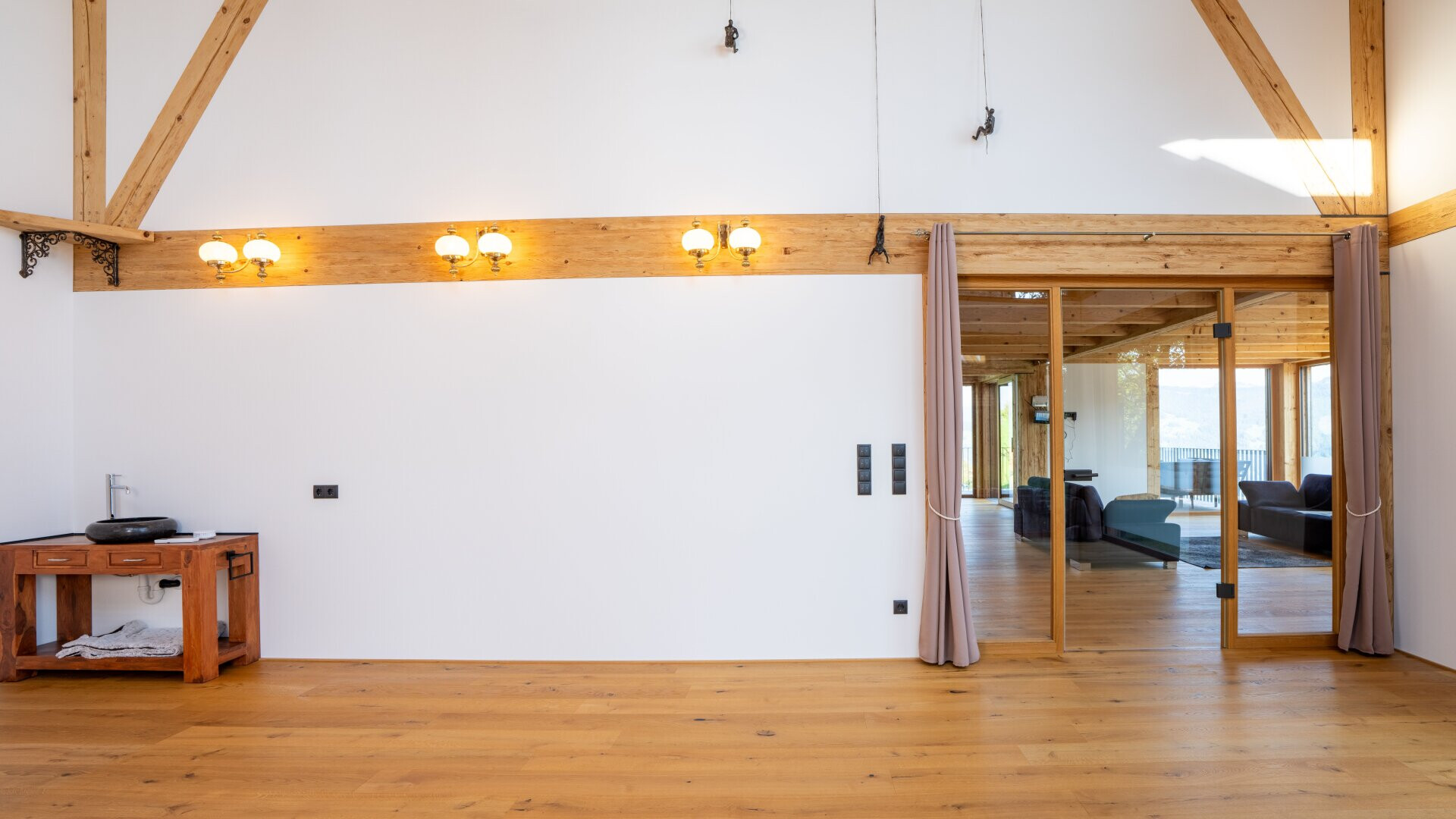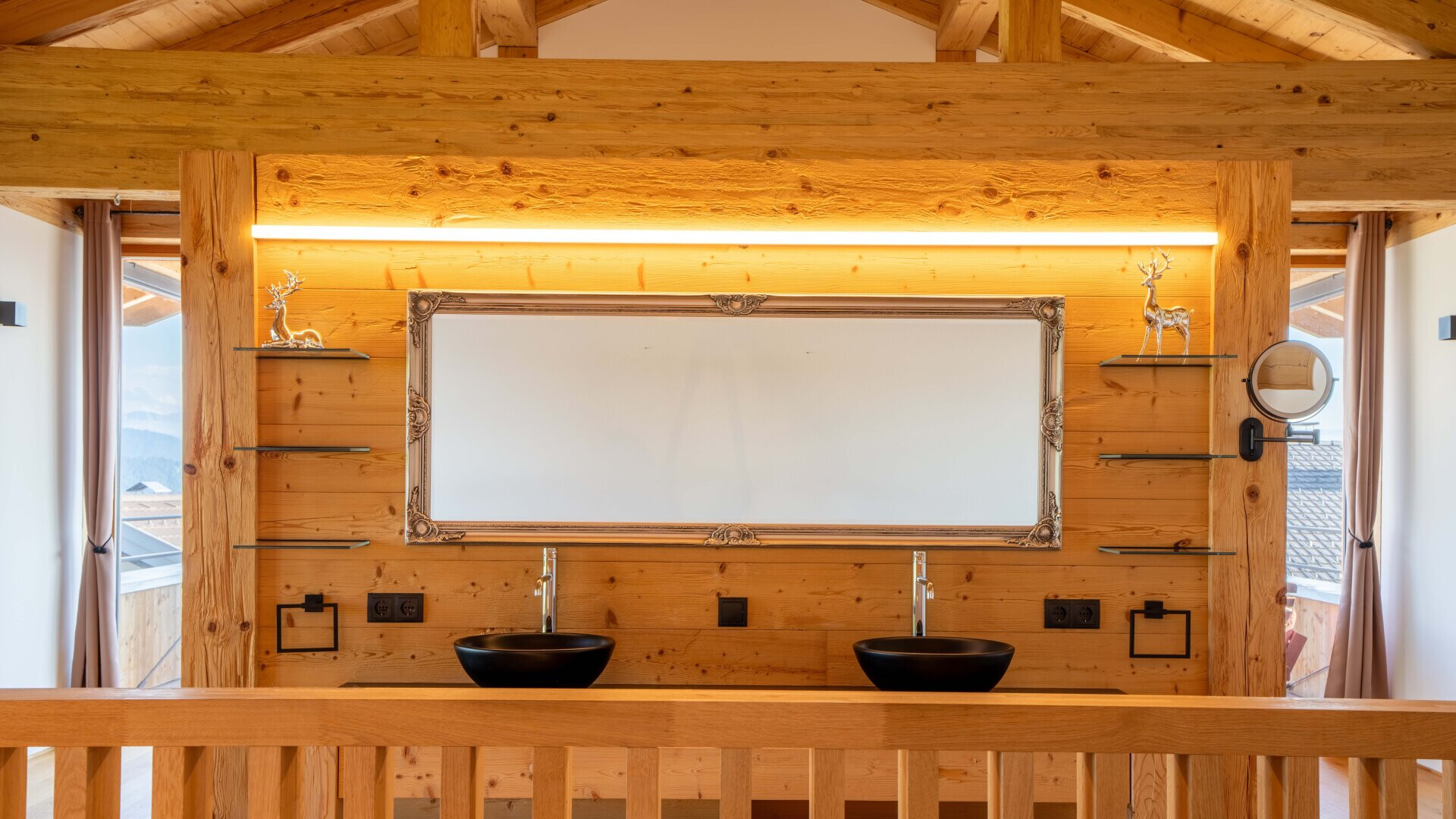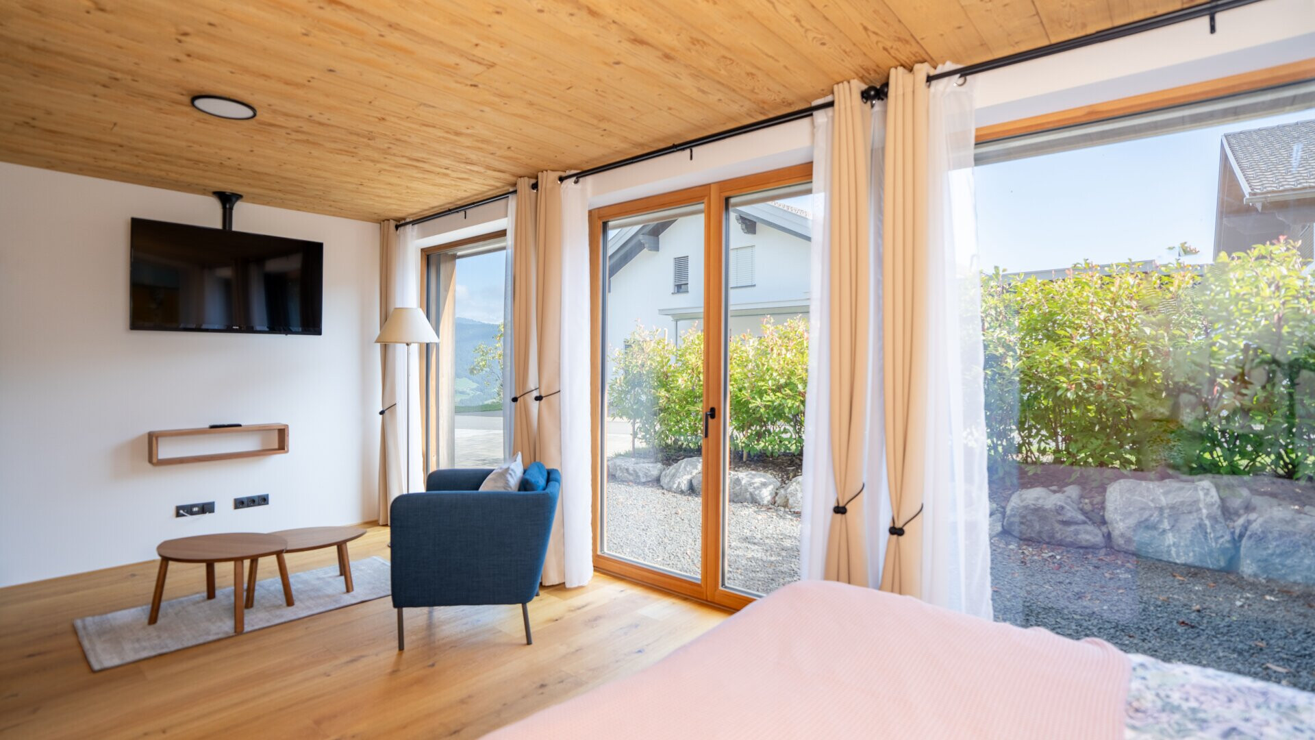 Das Chalet ist ein Holzhaus, das nach Süden ausgerichtet ist. Die großzügigen, bodentiefen Fensterfronten sorgen für ein lichtdurchflutetes Ambiente und bieten Fernblick sowie beeindruckende Bergpanoramen. Der offene Grundriss verleiht dem Haus eine moderne und großzügige Atmosphäre. Ein besonderer Blickfang ist der aufwändig mit Naturstein verblendete Sockel sowie das teils verwendete Altholz.