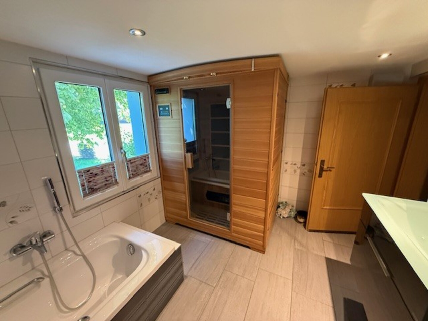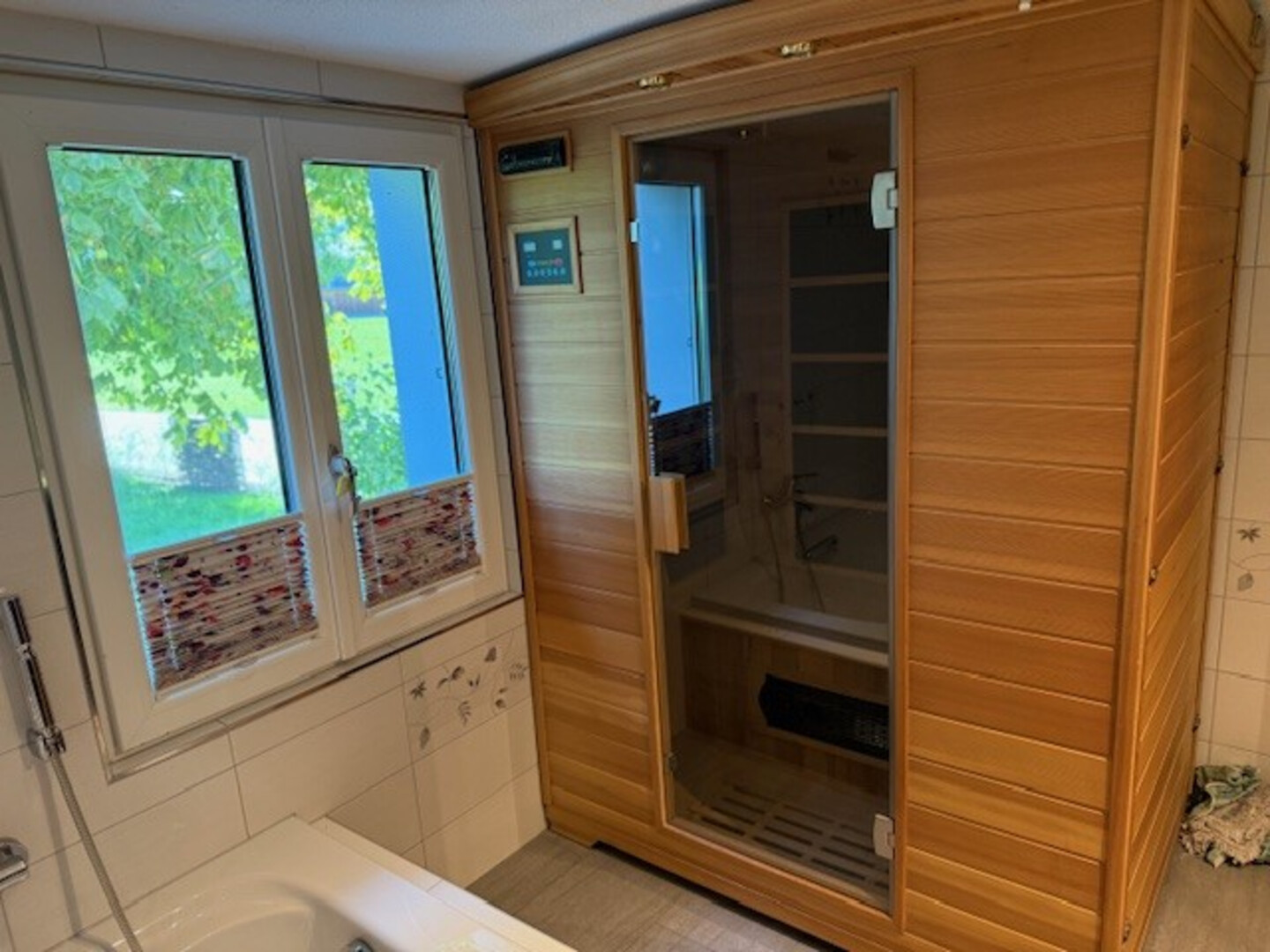 Badezimmer mit Dusche und WC und Sauna