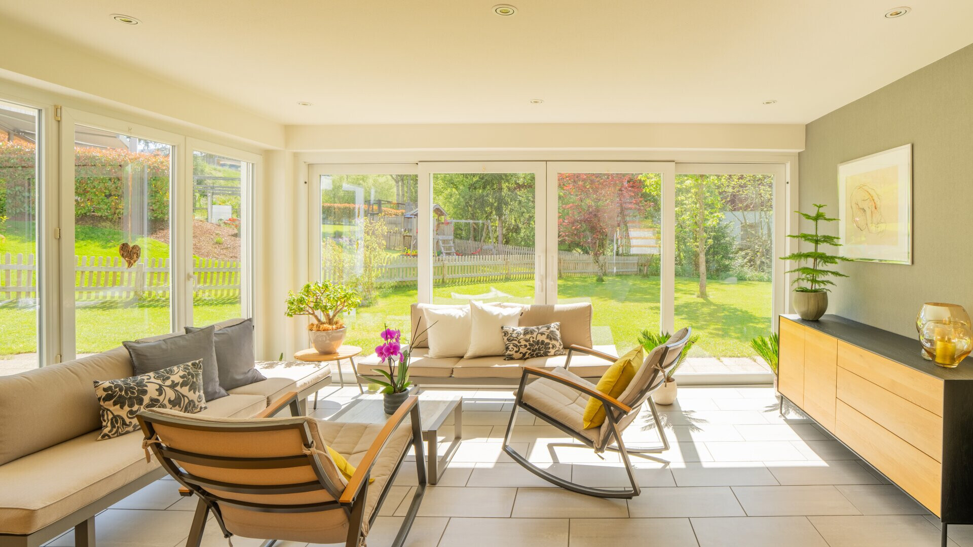Die gesamte Wohnfläche beträgt rund 170 m² und verteilt sich auf zwei Ebenen mit praktischer Raumaufteilung. Jeder Wohnraum bietet Zugang ins Freie. Im Erdgeschoss auf die großzügige Terrasse, im Untergeschoss direkt in den Garten.