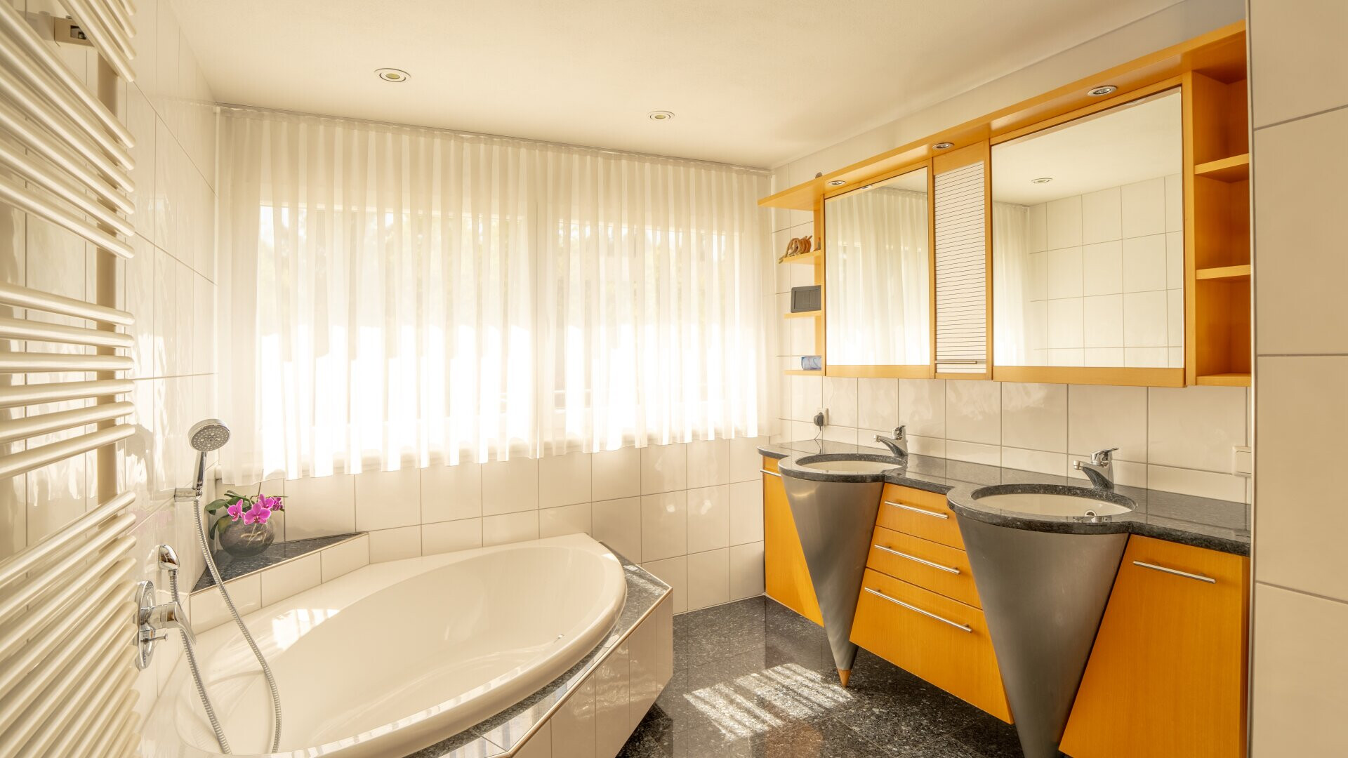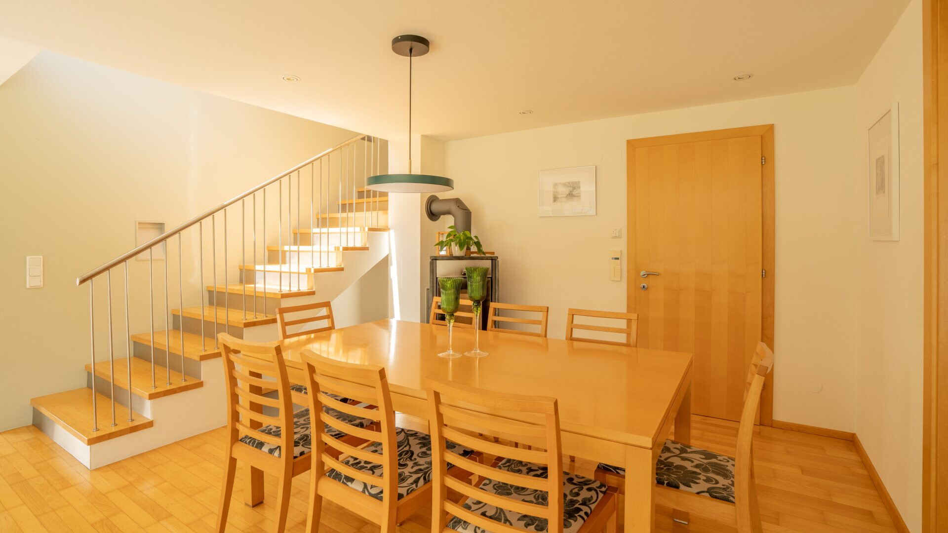 Das Gebäude ist an ein modernes BUS-System angebunden, die elektrischen Jalousien (Wohnzimmerfront 2024 erneuert) lassen sich zentral steuern. Die Fußbodenheizung sorgt in Kombination mit einem Schwedenofen im Wohnbereich für wohlige Wärme. Ergänzt wird die hochwertige Ausstattung durch exklusive Beleuchtung von Zumtobel. Auch die Einbaugeräte in der Küche wurden 2024 durch neue Modelle von Bosch und Siemens ersetzt. (Geschirrspüler und Kühlschrank)