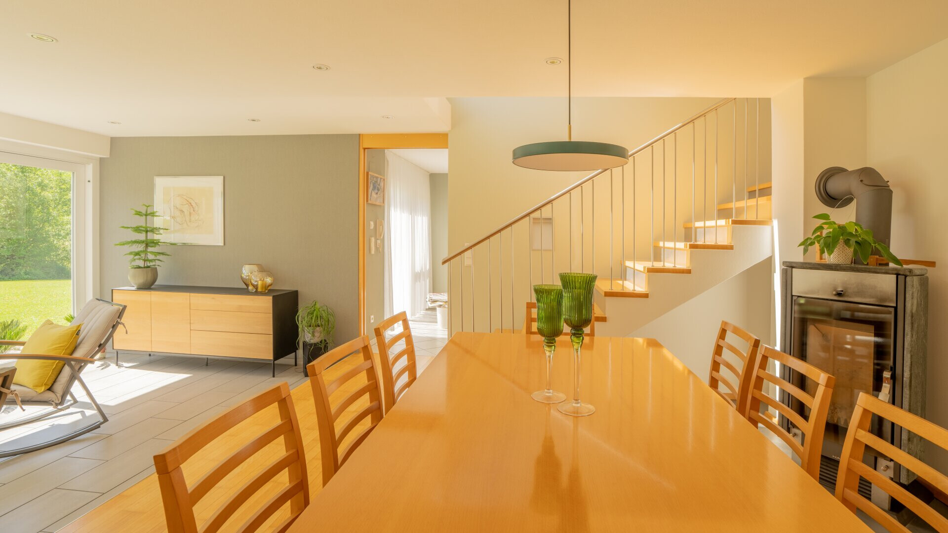 Im Untergeschoss ist ein offener, lichtdurchfluteter Wohn- und Essbereich mit über 34 m² untergebracht. Dieser hat einen direktem Gartenzugang über die großen Hebeschiebetüren. Angrenzend befindet sich die Küche mit modernisierten Geräten.
