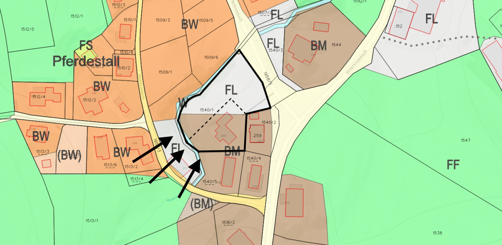 Der Großteil der angebotenen Fläche ist als Baufläche Mischgebiet gewidmet, ein kleinerer Anteil als landwirtschaftliche Freifläche. Das Gebäude selbst liegt außerhalb der Wildbach- Gefahrenzonen, Teile des Grundstücks sind in der gelben und roten WLV-Zone ausgewiesen.