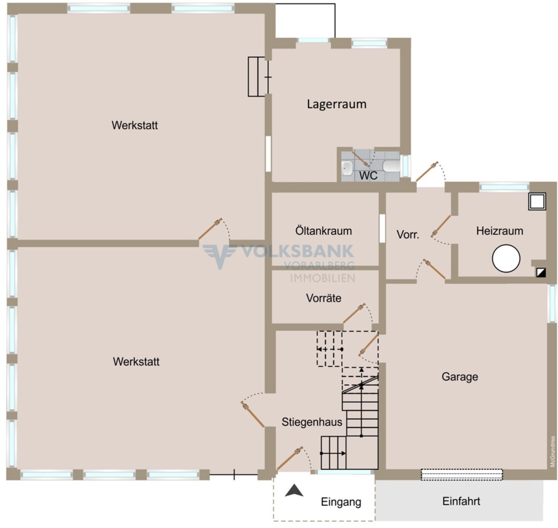 Im Erdgeschoss ist eine vermietete Werkstatt, ehemalige Stickerei, untergebracht. Zudem befindet sich im Wohnhausteil eine Vorratskammer, Garage, Heizraum sowie der Öltankraum.