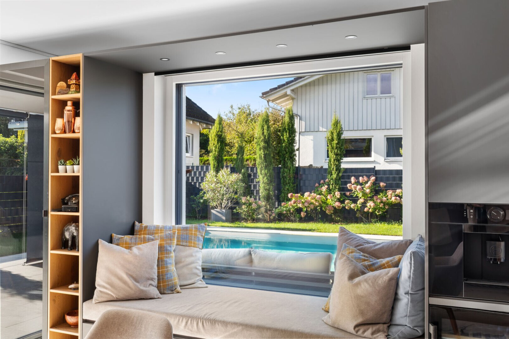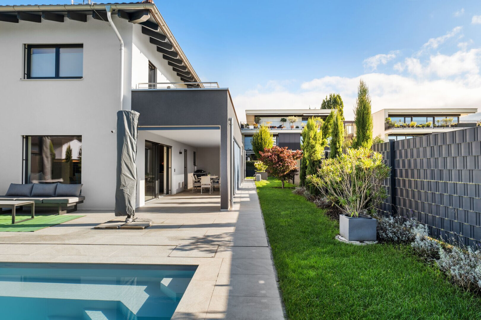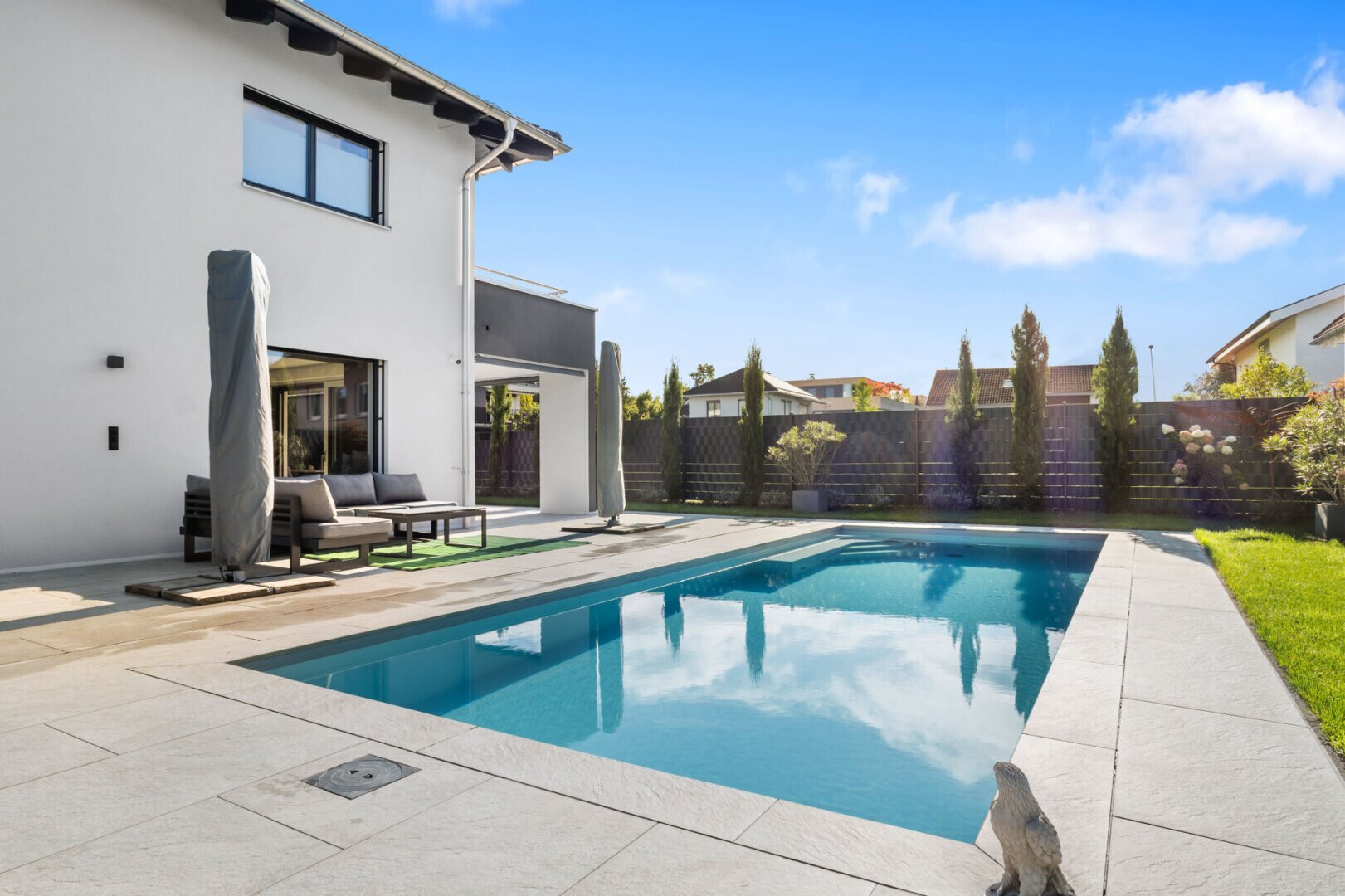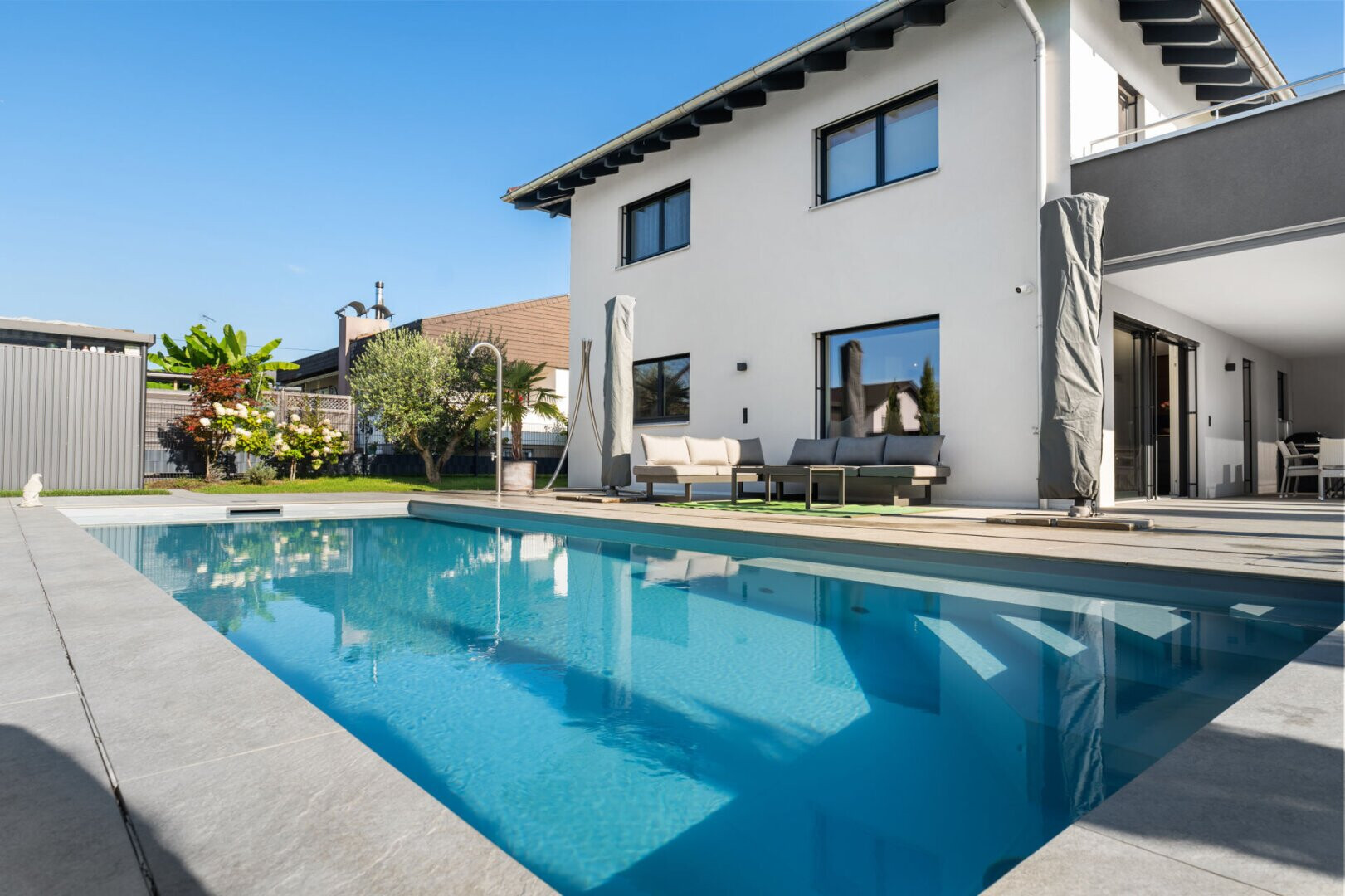 Ein besonderes Highlight ist der eigene Swimmingpool, der den Garten zu einer privaten Wellness-Oase macht. Hier können Sie Entspannung und Urlaubsfeeling in Ihrem eigenen Zuhause genießen.