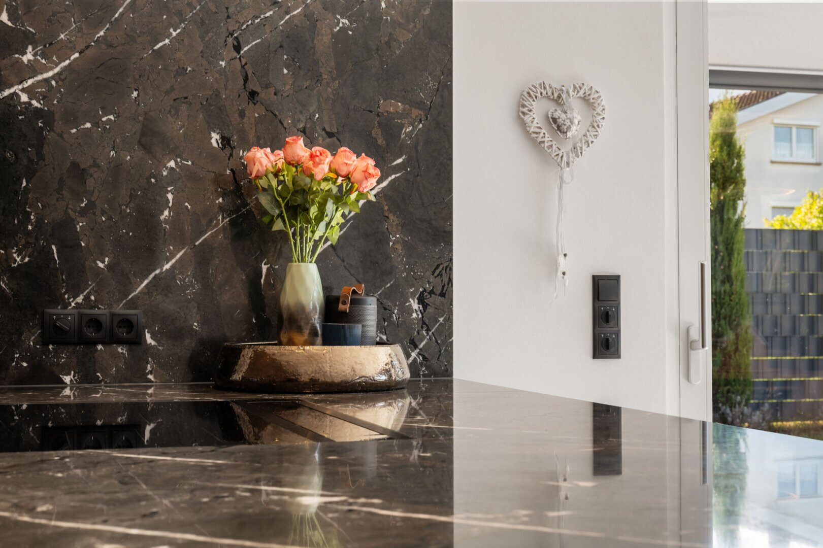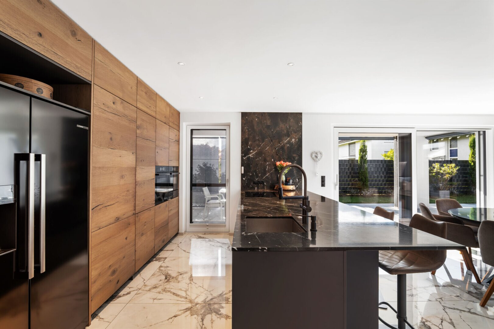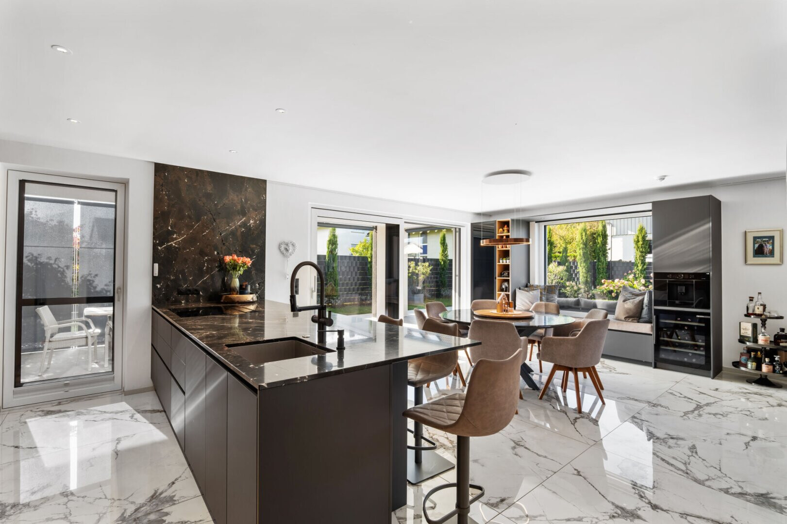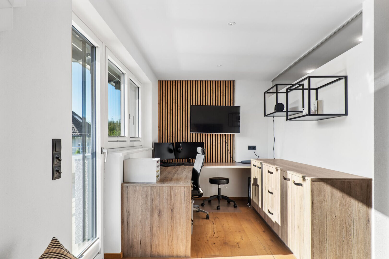 Die klare, moderne Architektur verbindet sich mit großzügigen Fensterfronten, die viel Licht in die Räume fluten und den Blick auf den Garten und die Umgebung öffnen. Das Haus ist mit einer offenen Wohnküche samt hochwertiger Einbauküche ausgestattet und bietet neben zwei Bädern auch ein separates Gäste-WC.