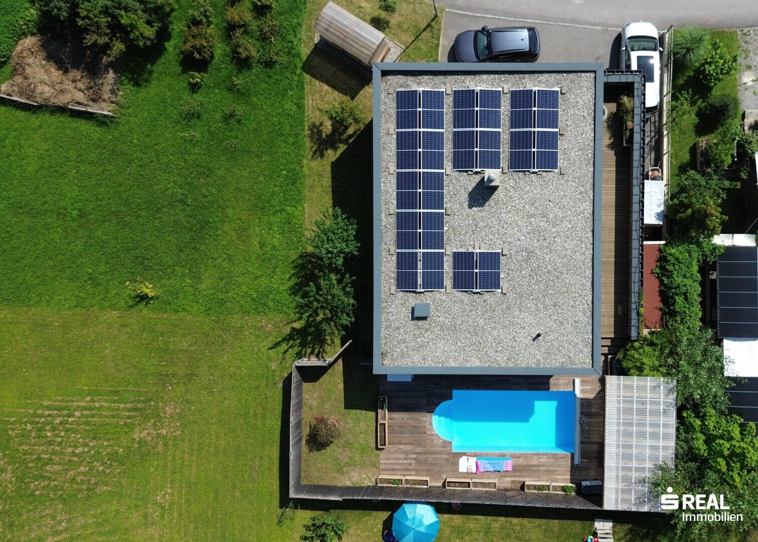 Der Außenbereich des Hauses lädt zum Verweilen ein. Der Garten bietet genügend Platz für Kinder zum Spielen, für gesellige Grillabende mit Freunden oder einfach für Momente der Ruhe und Entspannung im Freien. Genießen Sie die sommerlichen Tage in Ihrem eigenen 3 x 6 Meter großen Pool.